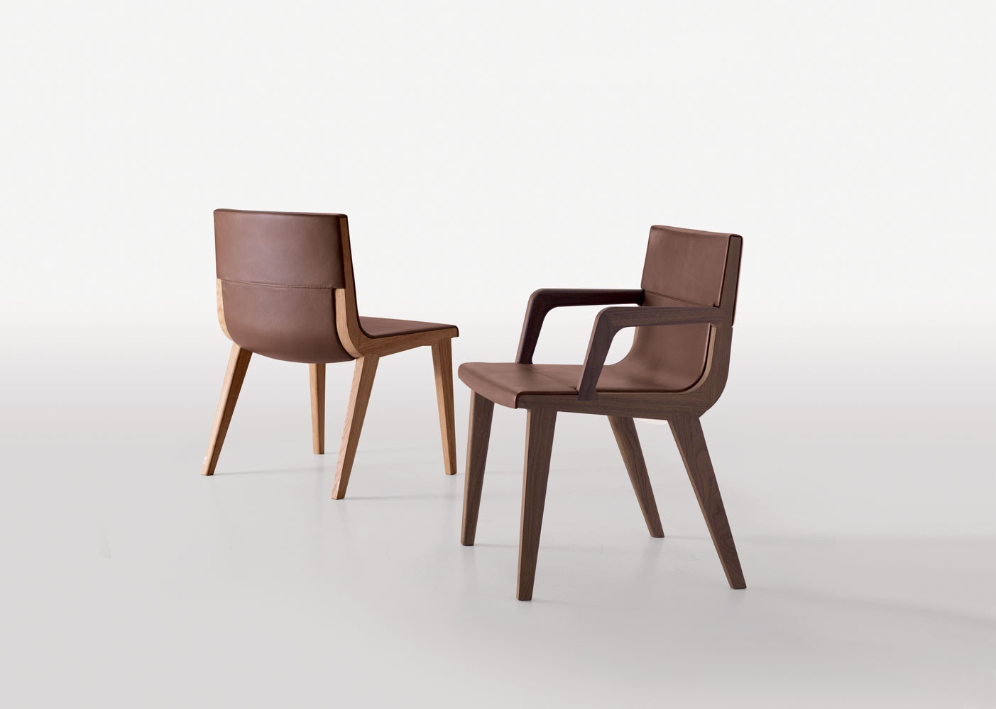 Chair with armrests from Acanto Maxalto Italian manufacturer. Frame: natural wood and steel. Upholstery in two versions, upholstered leather or fabric, depending on customer needs. Colours in stock.