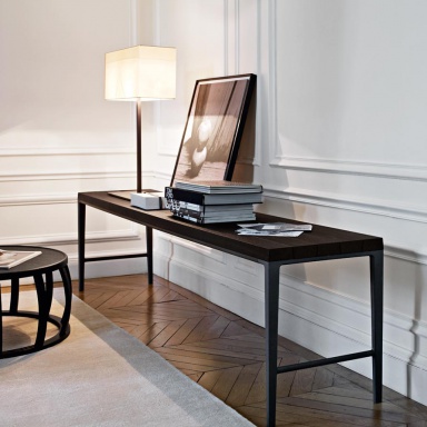 The console Antares from the Italian manufacturer Maxalto. Glossy chrome-plated steel construction.The top can be rectangular or square with rounded angles and refined details on the curved edges. The table top is made of marble or MDF wood. The frame is made of chrome steel, also available in Nickel steel.