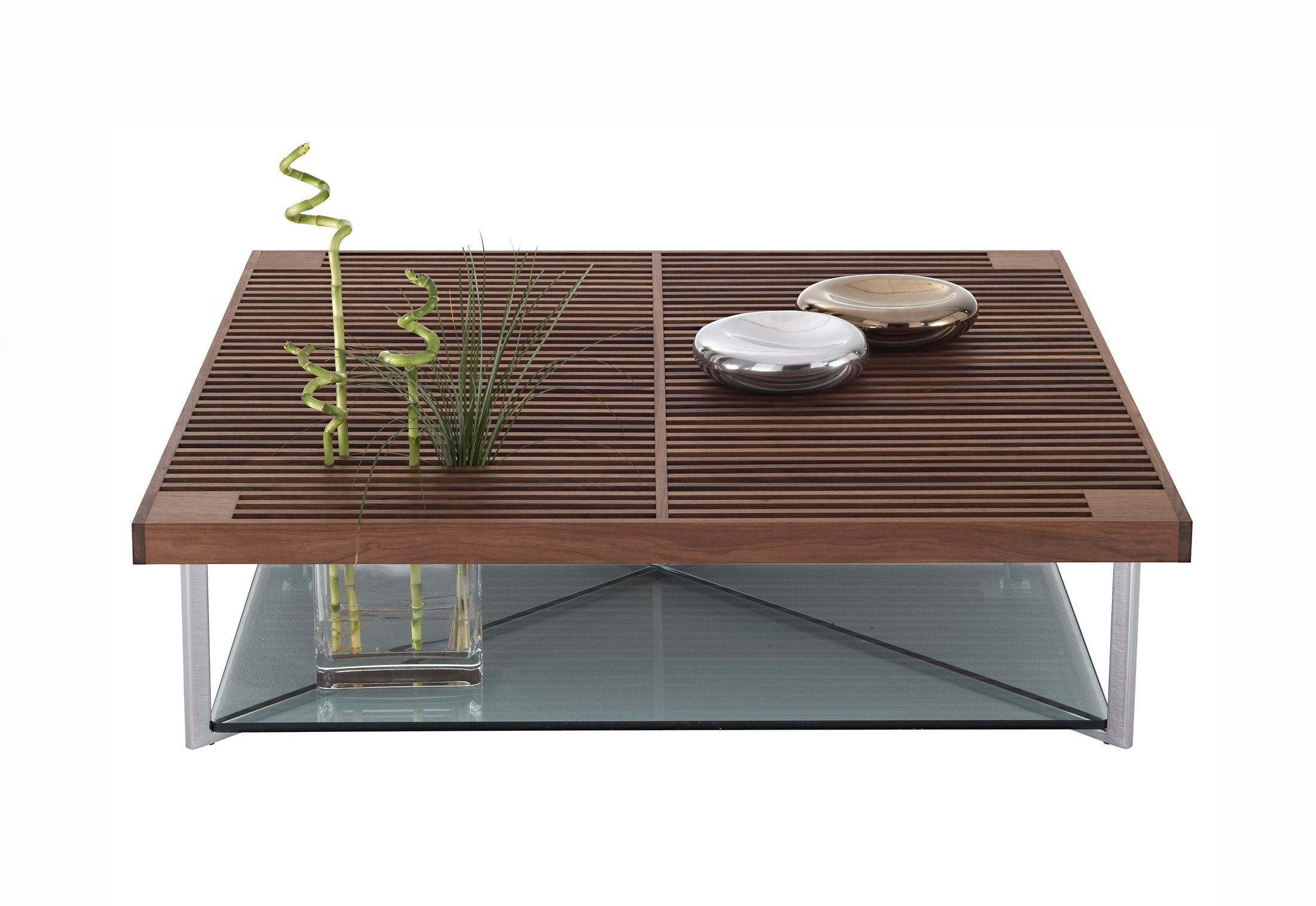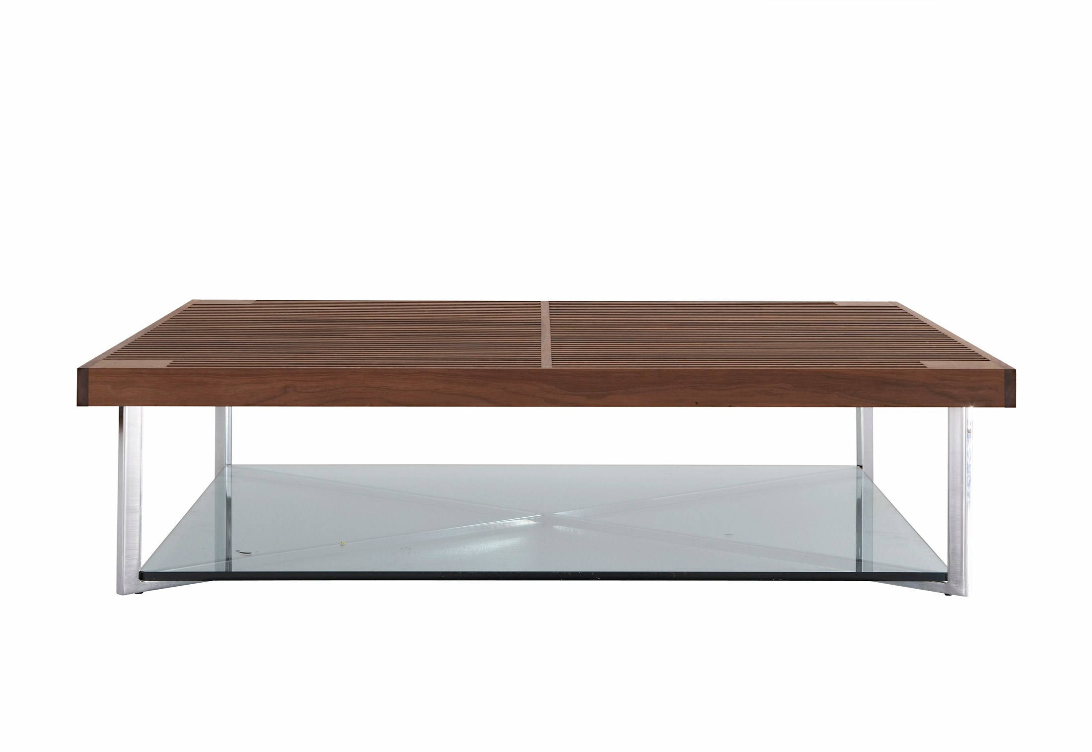 Coffee table from PONTON French manufacturer Ligne Roset. Square coffee table with wooden tabletop in parallel slits. The table top is made of solid walnut, and the lower panel of clear glass. Steel construction legs in brilliant chrome. The model is made in modern style.