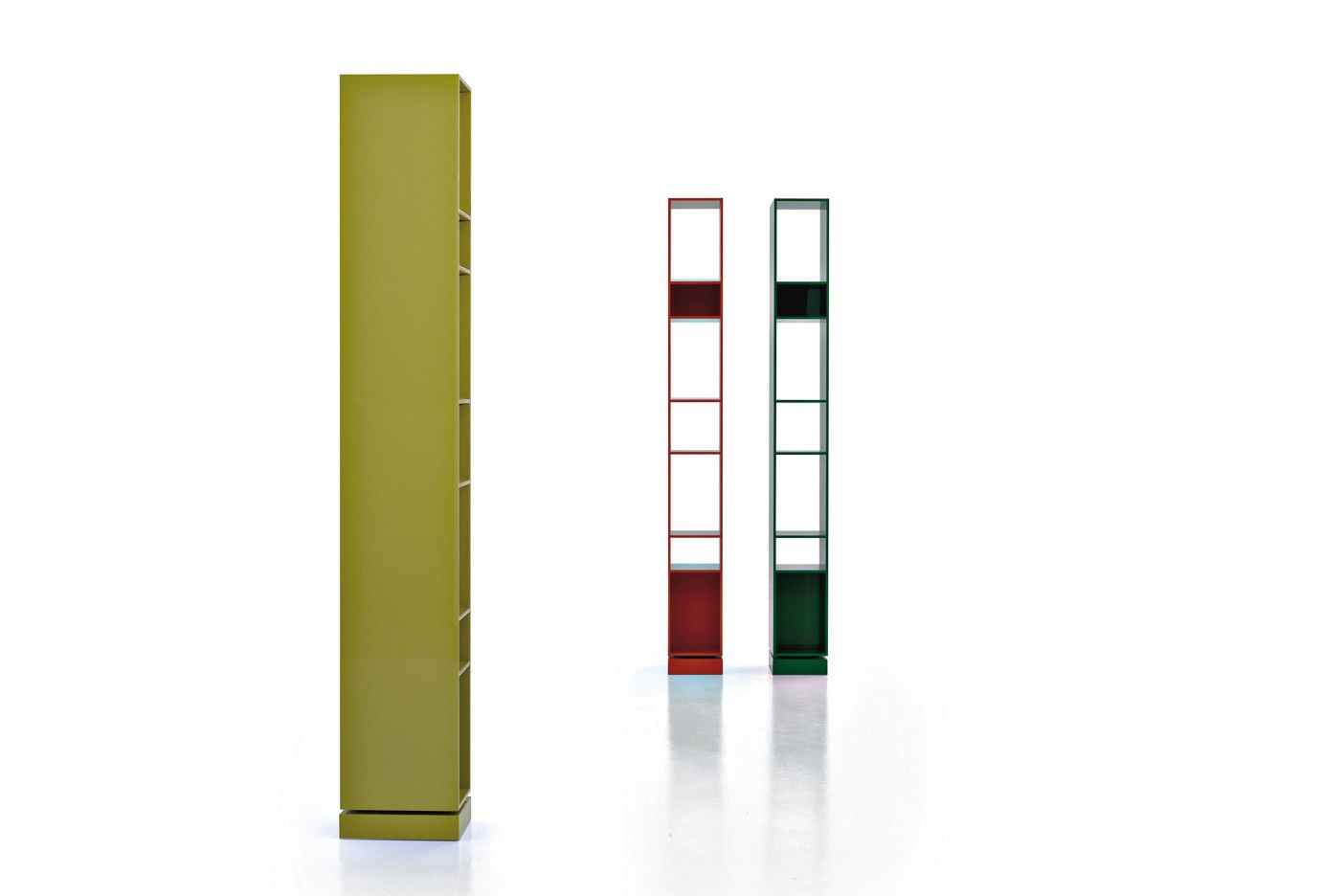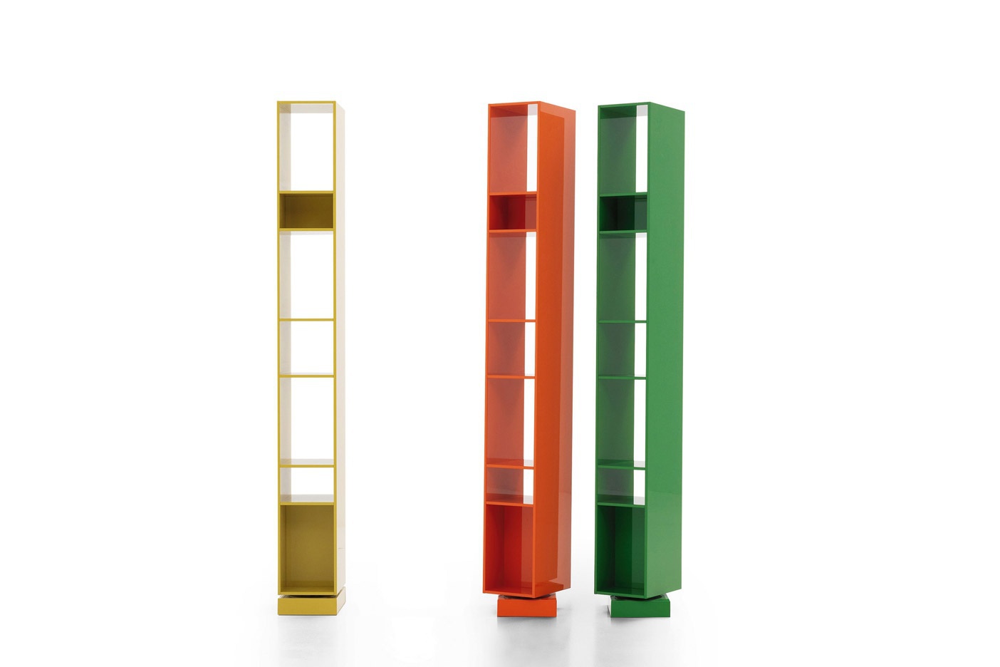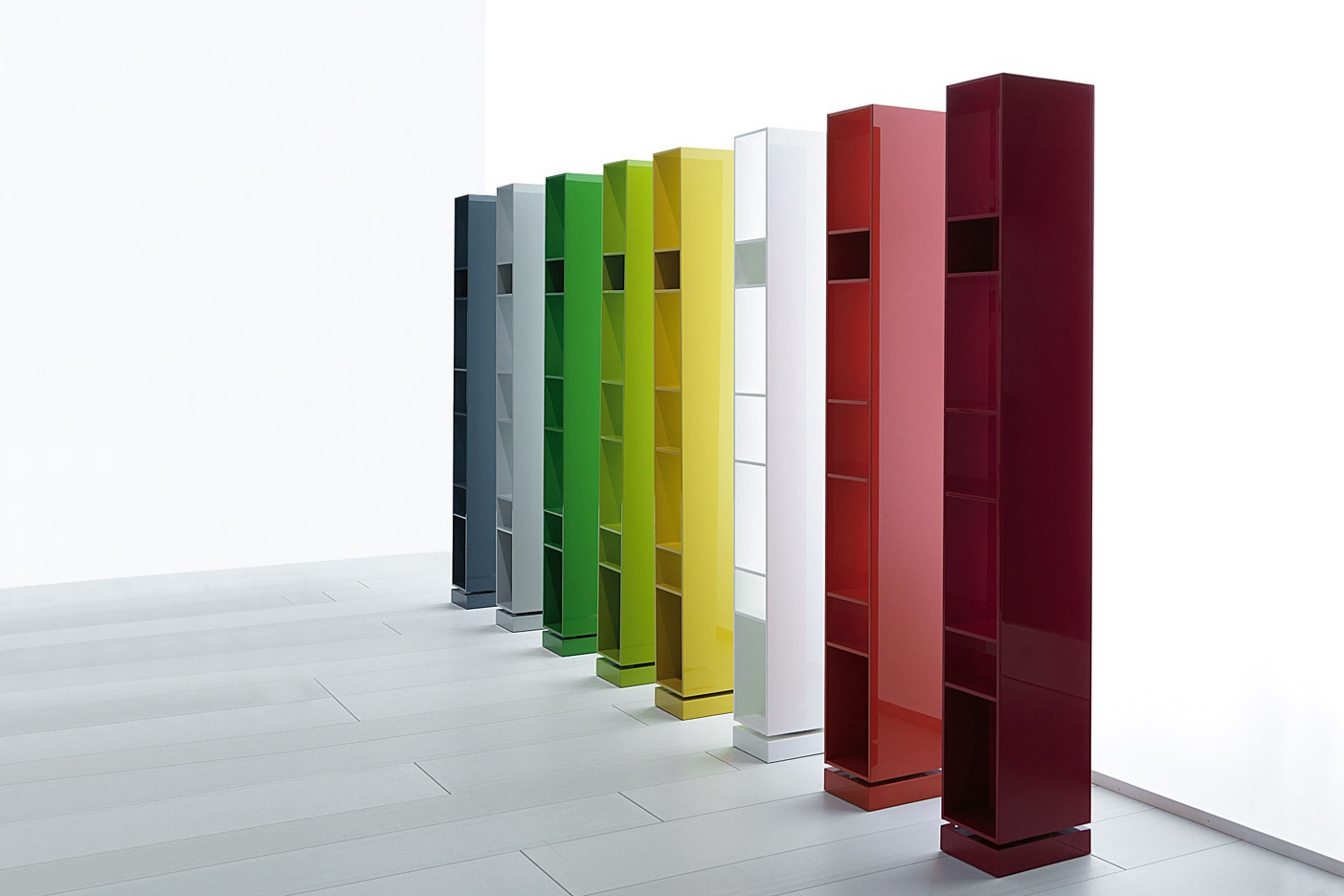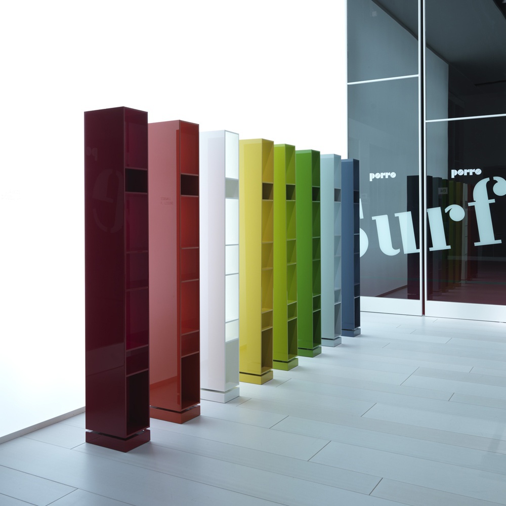 Rack Sidewall from Italian manufacturer Porro. Rack wood with shelves of various heights. Available in hanging and floor versions. The hinged shelf mounted on the wall so that access is possible to the shelves on the sides, and the front is a blind facade. Outdoor rack - swivel. The basic version of the model is available in white lacquer finish made of ebony, covered with black lacquer outside and red and blue and yellow color inside. In 2009 there are new versions, inside and outside covered with a bright high gloss lacquered different from the collection of the factory.