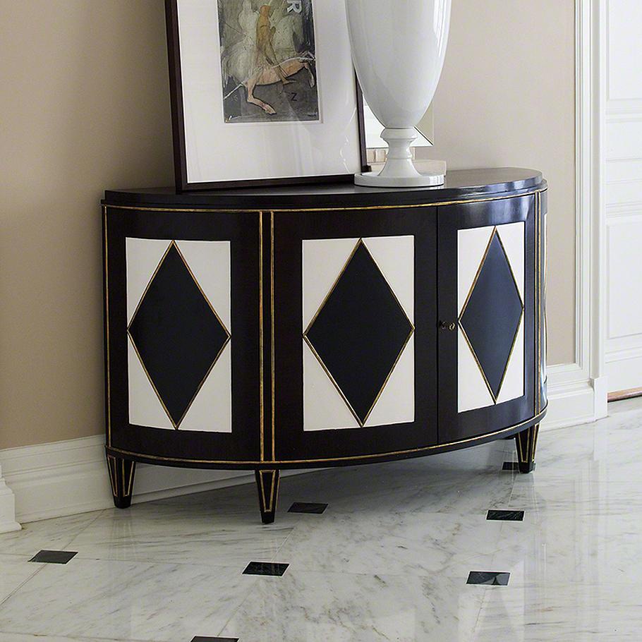 A snack bar Russian from an American manufacturer Global Views. Beautiful sideboard, made in the Rococo style, undoubtedly inspired by the work of French artists, commissioned by the Russian aristocrats in the early nineteenth century. Original diamond finish, unusual colors, gold trim - all are impressive and makes her a decent interior. Frame, doors and carved tapered legs made of wood and finished in lacquer, black and ivory. Convex fa?ade, two wing doors can be locked. The top, doors and legs contour finished in gold leaf. Global Views when creating their collections of furniture and accessories uses both the experience of older European couture houses such as Chanel, Balenciaga and Hermes and fresh ideas of modern designers. Colorful, multi-layered collection are a refreshing blend of Antiques and the sense of modernity.