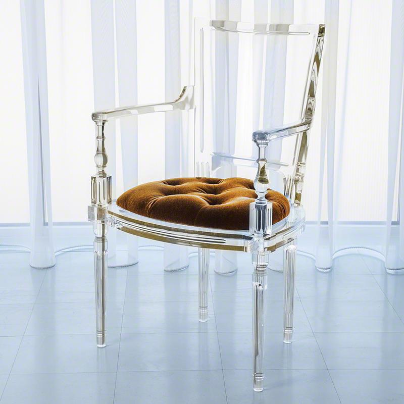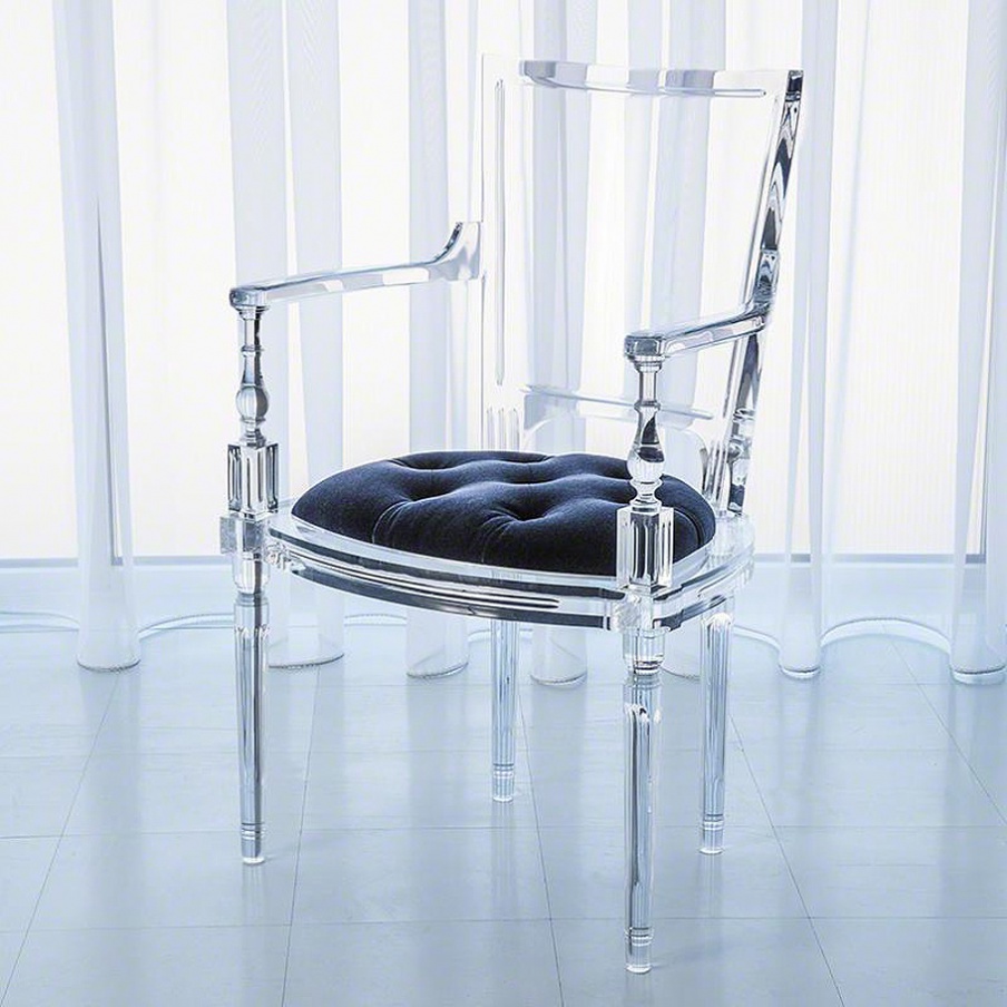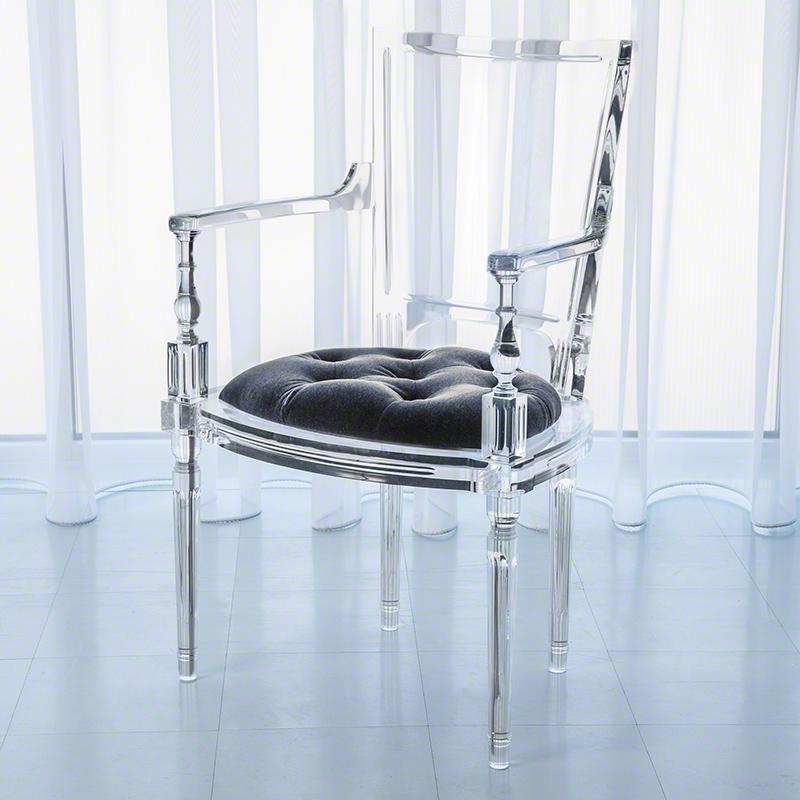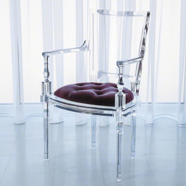 Chair Marilyn from the American manufacturer Global Views. Design chair, made in the style of glamor, was developed based on the best-selling chairs of the company. The traditional silhouette of a chair with armrests, made of transparent cast acrylic Italian, hovers and dissolves in the air. The soft seat fabric (63% mohair, 37% polyester) embellished with recessed buttons. The chair is available in five colors: tin grey, Burgundy, Golden brown, emerald green and blue. Global Views when creating their collections of furniture and accessories uses both the experience of older European couture houses such as Chanel, Balenciaga and Hermes and fresh ideas of modern designers. Colorful, multi-layered collection are a refreshing blend of Antiques and the sense of modernity.