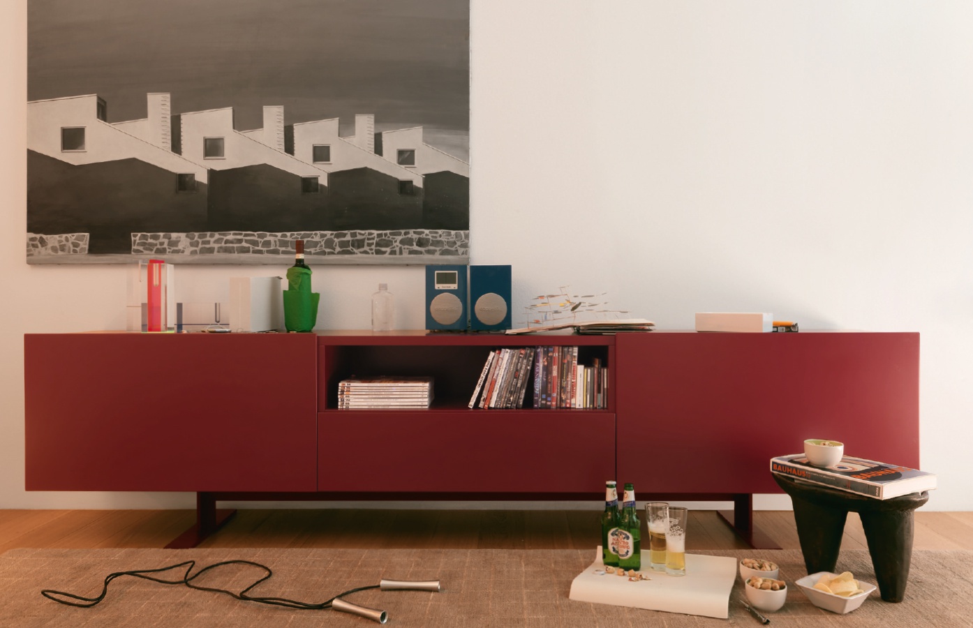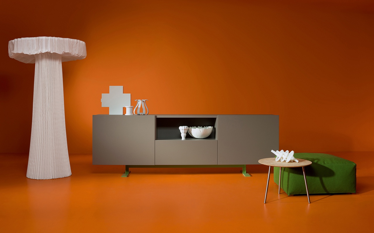 Luxor stand from Italian manufacturer Cappellini. Suitable for both living room and office - available in matte or patent finish. The metal base in the same color. Spacious, simple and well-designed to the smallest detail. The body is made partially of wood and panels of plywood poplar. Specially designed hinges. The modern design.