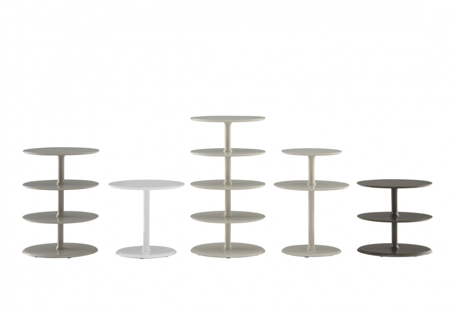 Pridivanny table ÉLYSÉE from the French manufacturer Ligne Roset. Countertops made of MDF panels with rounded edges, 40 or 50 cm in diameter, connected to the tone lacquered aluminium tubes. - Color options: satin lacquer in white, beige or gray. Side table with three levels can be two-tone. Print by Pierre Paulin engraved below the top countertop. The model is made in modern style.