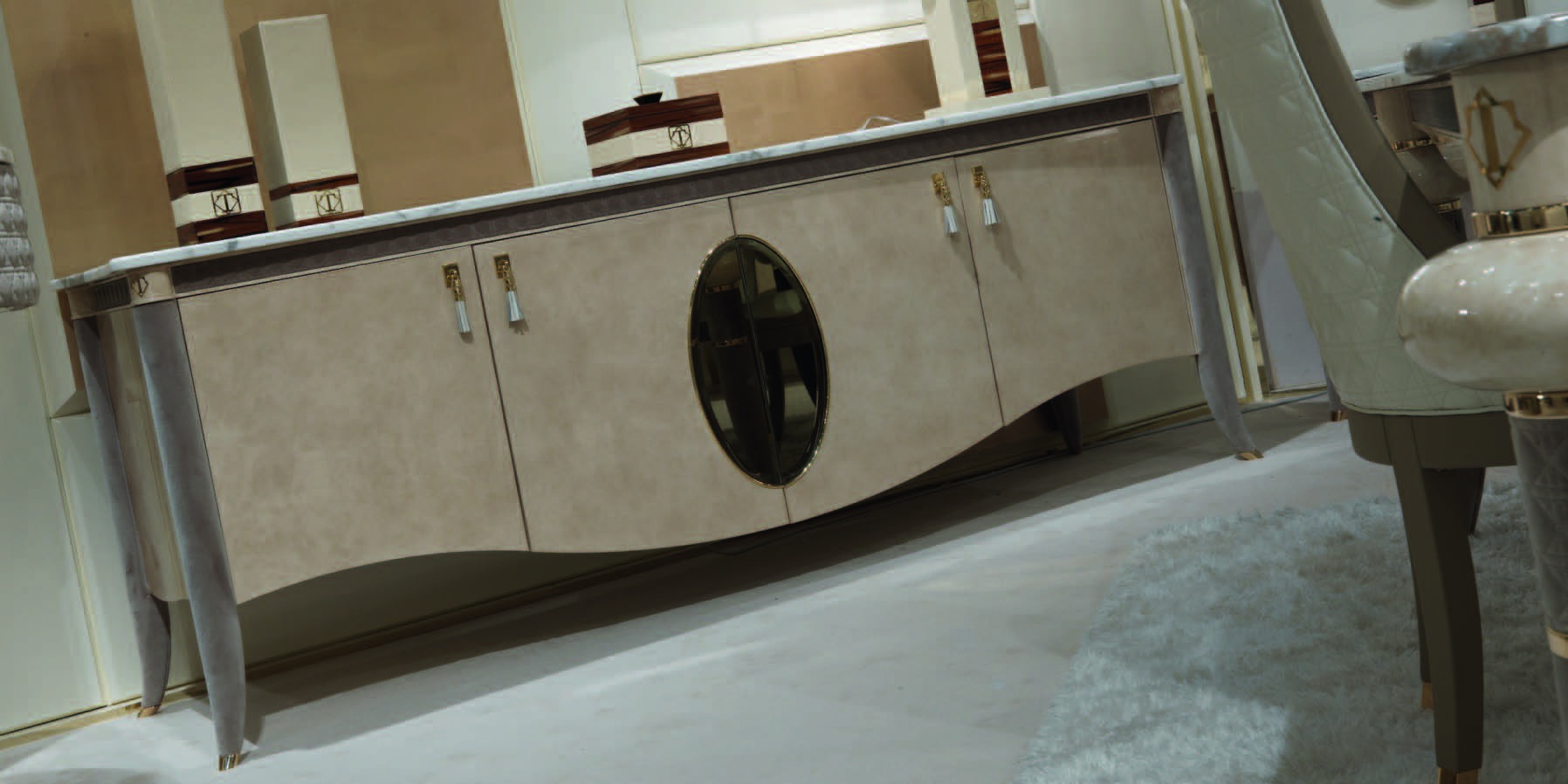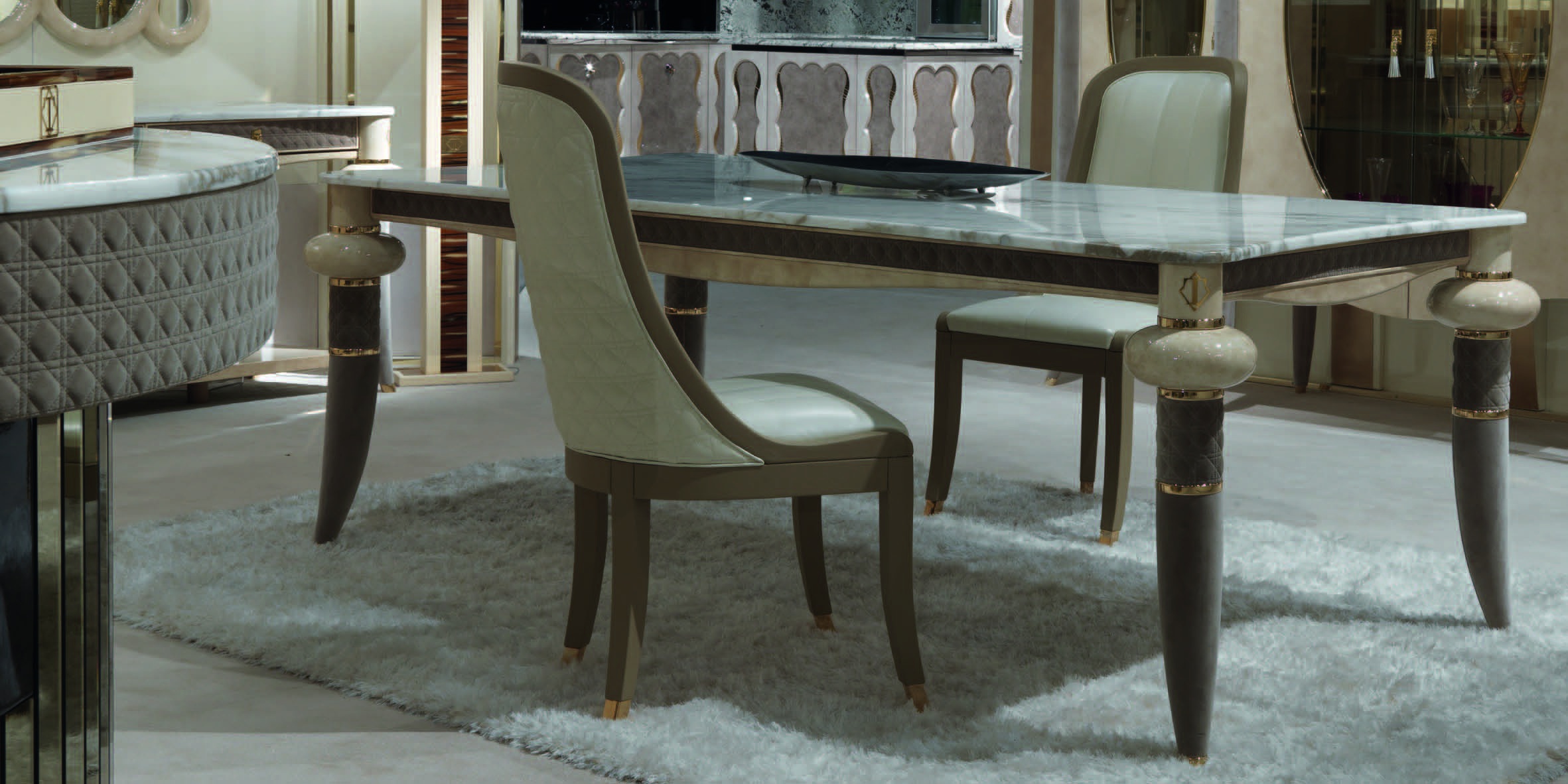 Caractere set for the dining room from Italian manufacturer Turri. This set includes: rectangular dining table, chairs without armrests in soft upholstery leather, showcase with glass shelves and partially flaps, leather trim sideboard 4-door lacquered, in leather. All frame elements are made of wood. Upholstered in leather from the company portfolio. Wood surfaces are varnished. Decor - finish leather, and gilded metal elements. Set in the art Deco style in duet with contemporary notes - a chic choice for modern elegant dining room.