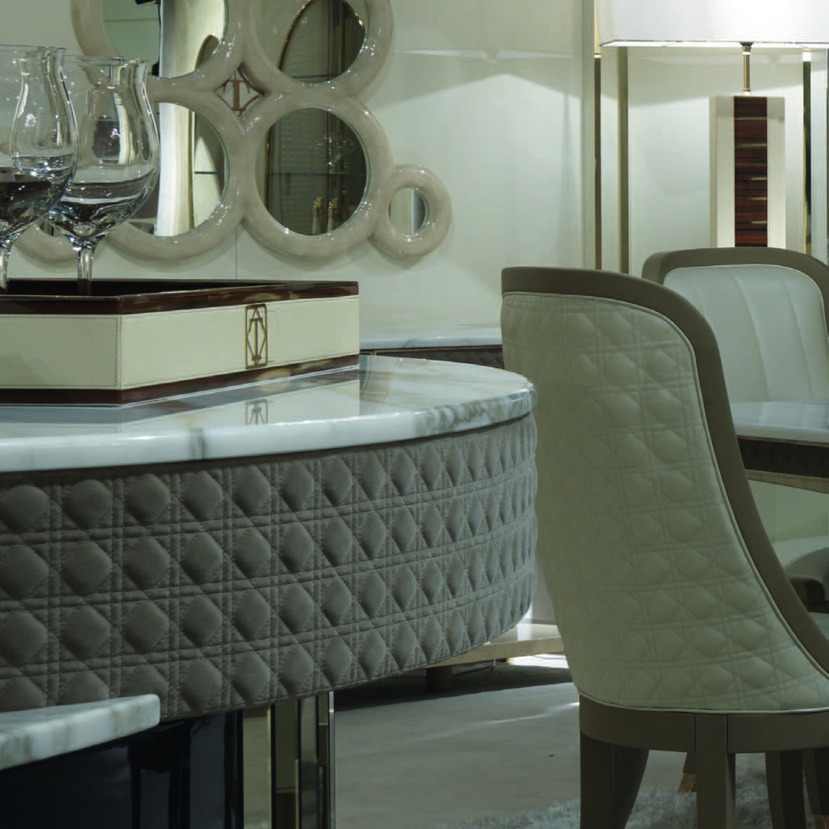Caractere chair from the Italian manufacturer Turri S. r.l.. a Model without armrests, with high backrest, frame made of wood. Surface finishing and upholstered in leather from the company portfolio. The decor presents a diamond-shaped padding on the rear surface of the backrest. Tips on the legs metallic gold. Chair in the art Deco style will perfectly complement refined dining room. The product comes in dining sets collection Caractere.