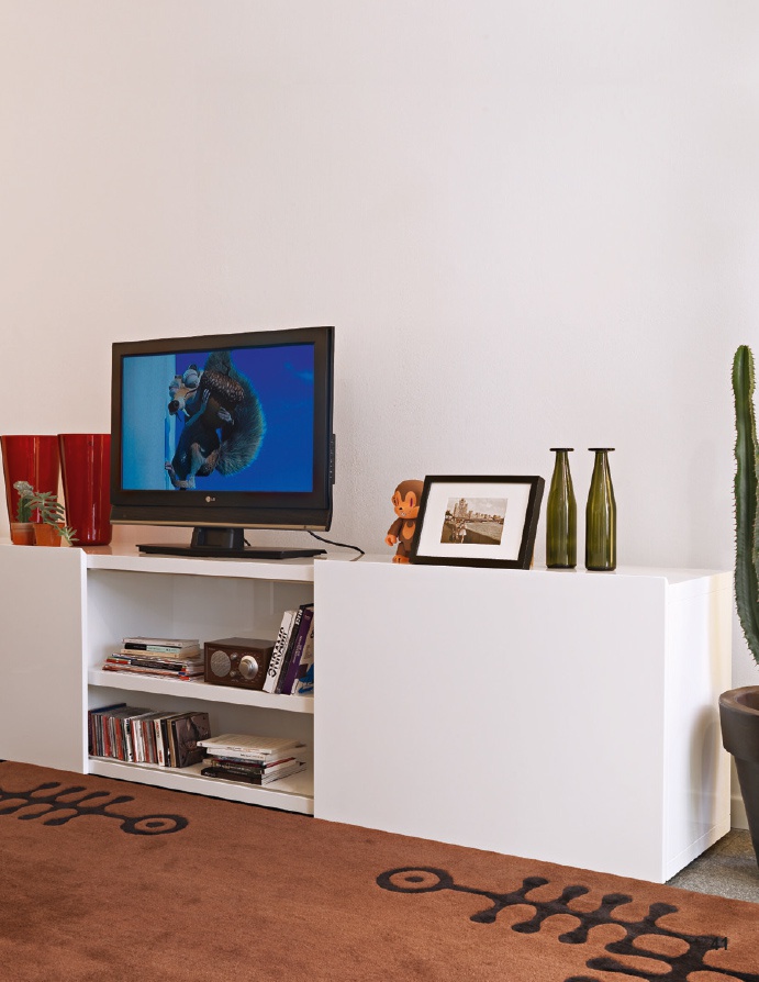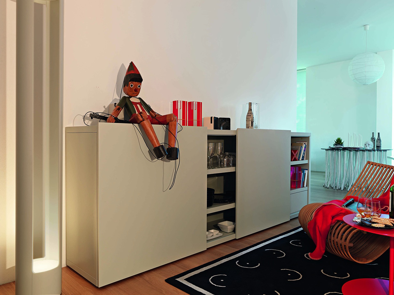 Hi Fi stand from Italian manufacturer Cappellini. Model with sliding doors, internal drawers and open shelves. Made of wood with a polished lacquer surface. Suitable for living room and children's room. The modern design. Colours in stock.