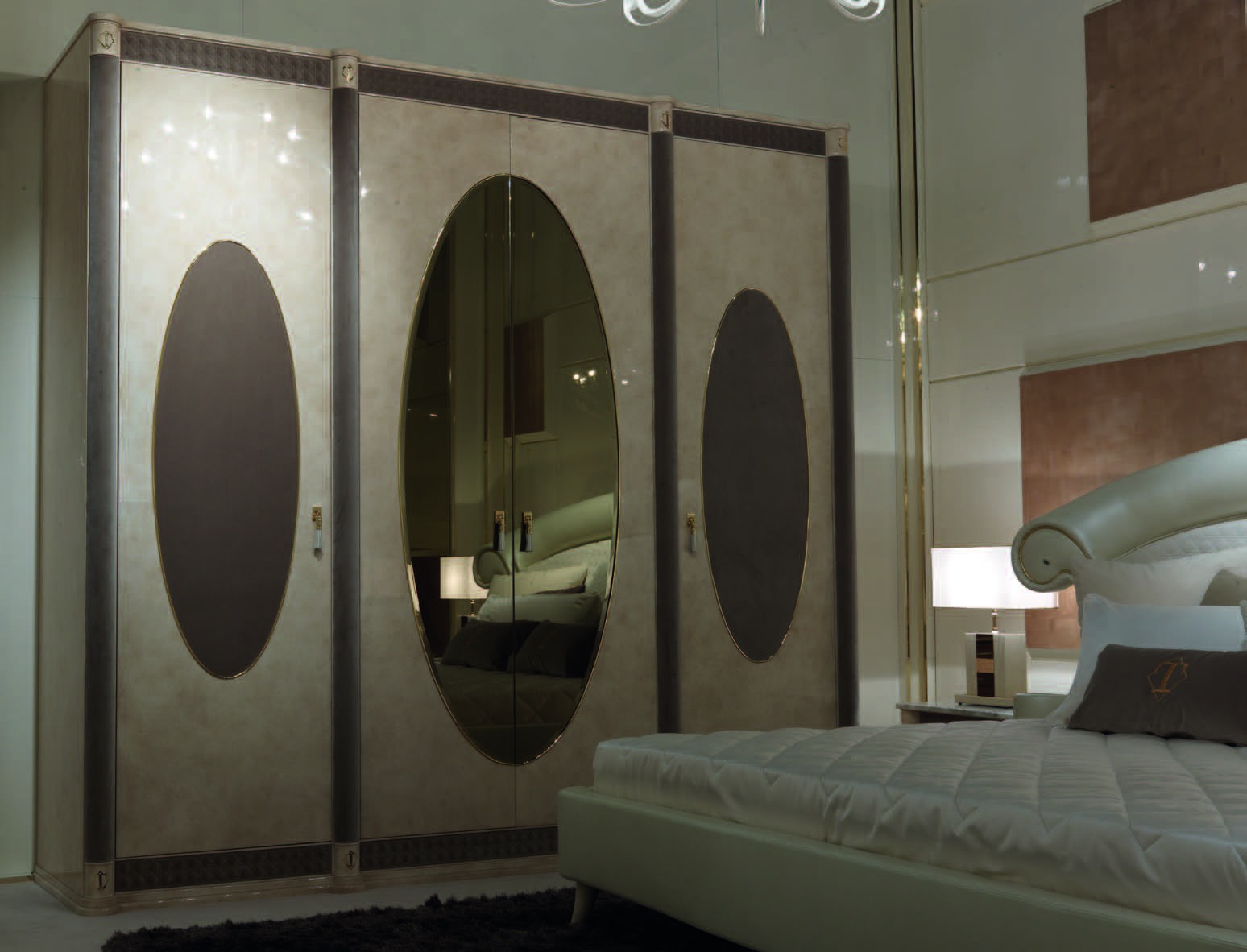 Wardrobe Caractere from the Italian manufacturer Turri. The frame is made from wood. The sash is decorated with leather inserts and mirrors. Surface finish lacquer and leather. Color palette - from the company portfolio. Accessories metal gold. The wardrobe in the art Deco style perfectly complement the bedroom. The product comes in a bedroom set collection Caractere.