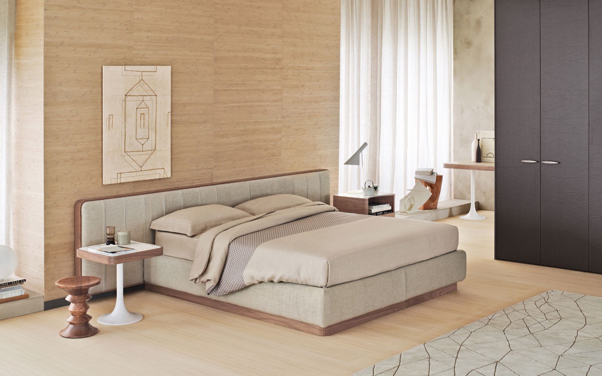 Double bed Ermes from the Italian manufacturer Flou. The bed is on a wooden base. Headboard and frame covered with leather or cloth. The model is made in modern style. Colours in stock.