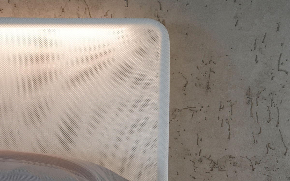 Double bed Essentia from the Italian manufacturer Flou. The bed on a metal frame. The legs are V-shaped. Finish options: black, white. Headboard in fabric from the company portfolio. The model is supplemented with a built-in led illumination. Modern style. Colours in stock.