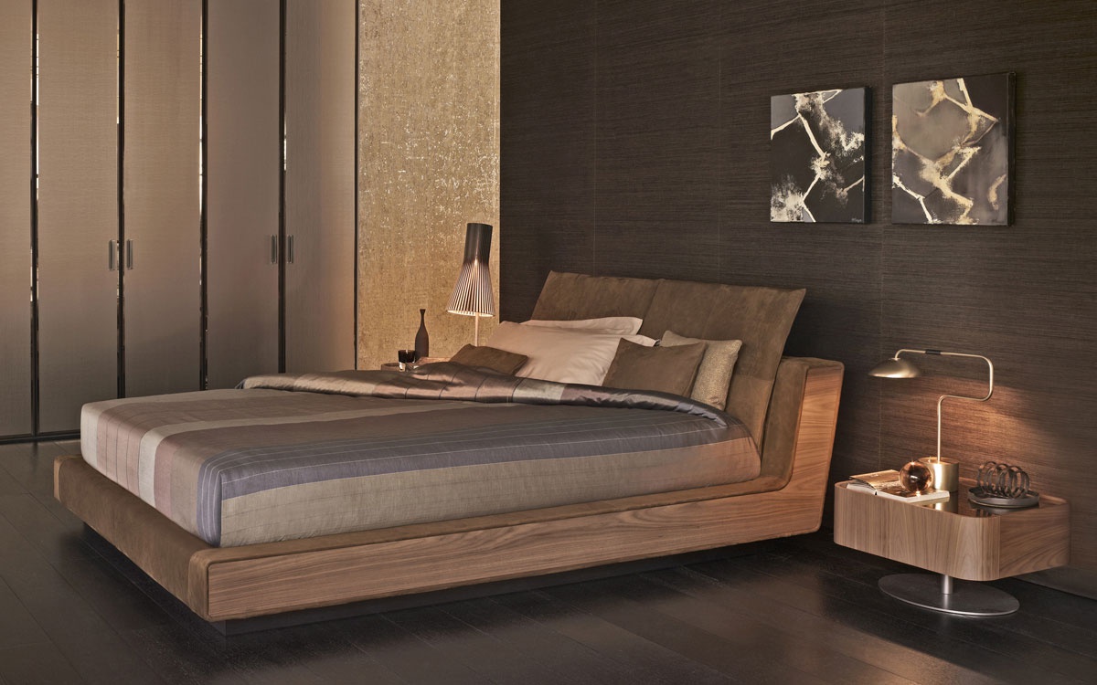 Double bed Sama from the Italian manufacturer Flou. The frame is made of walnut Canaletto in polished / natural decor. Visible parts of the grounds may be fully upholstered in fabric or leather. The headboard is offered in similar trim. Sleeping space complemented by a supporting lamella. The model can be implemented with built-in storage. The modern design.