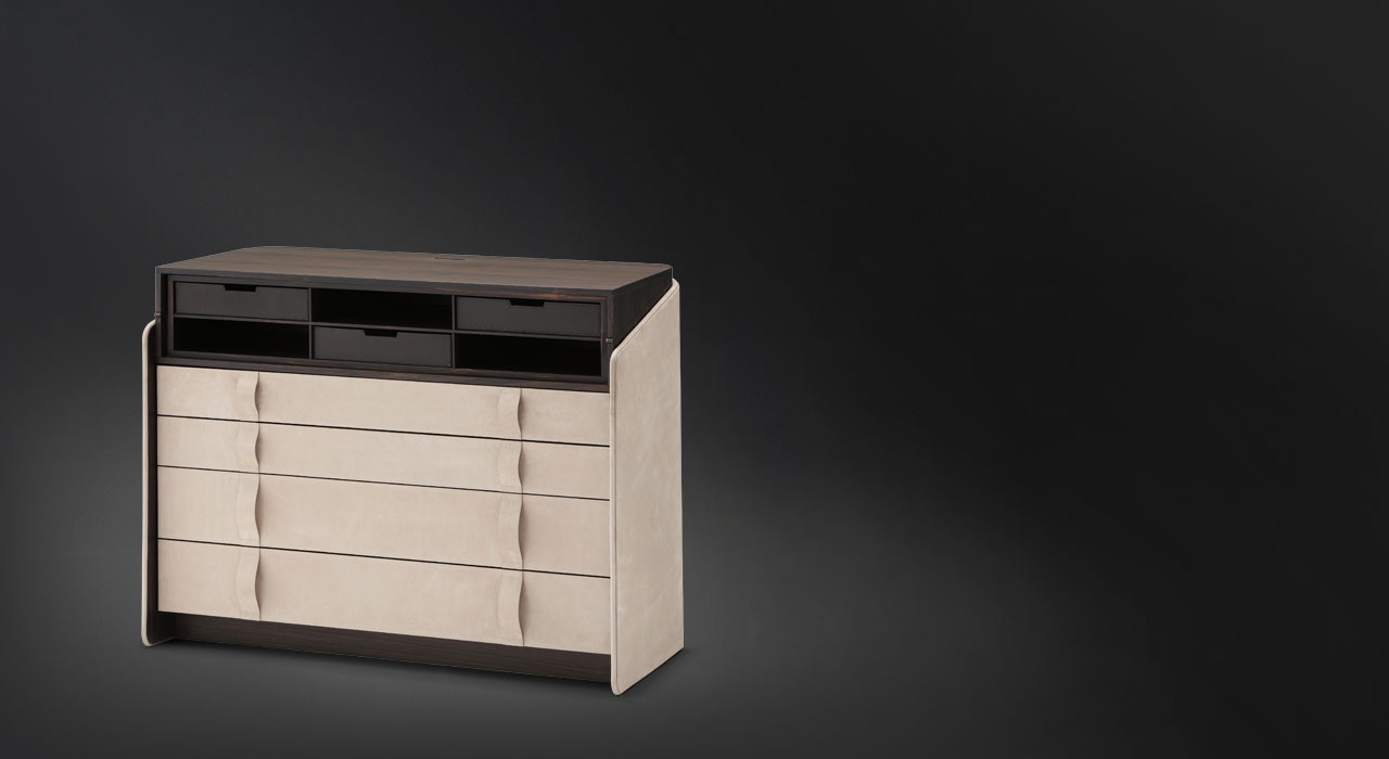 Dresser-Bureau of Gentleman from the Italian manufacturer Flou. The outer surface of the frame covered in leather with a plain / contrasting piping. New top finished with a Matt veneer ebony. In the lower part are four drawers with leather exterior and handles (boxes equipped with a mechanism for smooth closing), the top – three drawers with leather facade and shelves. The model is made in modern style.