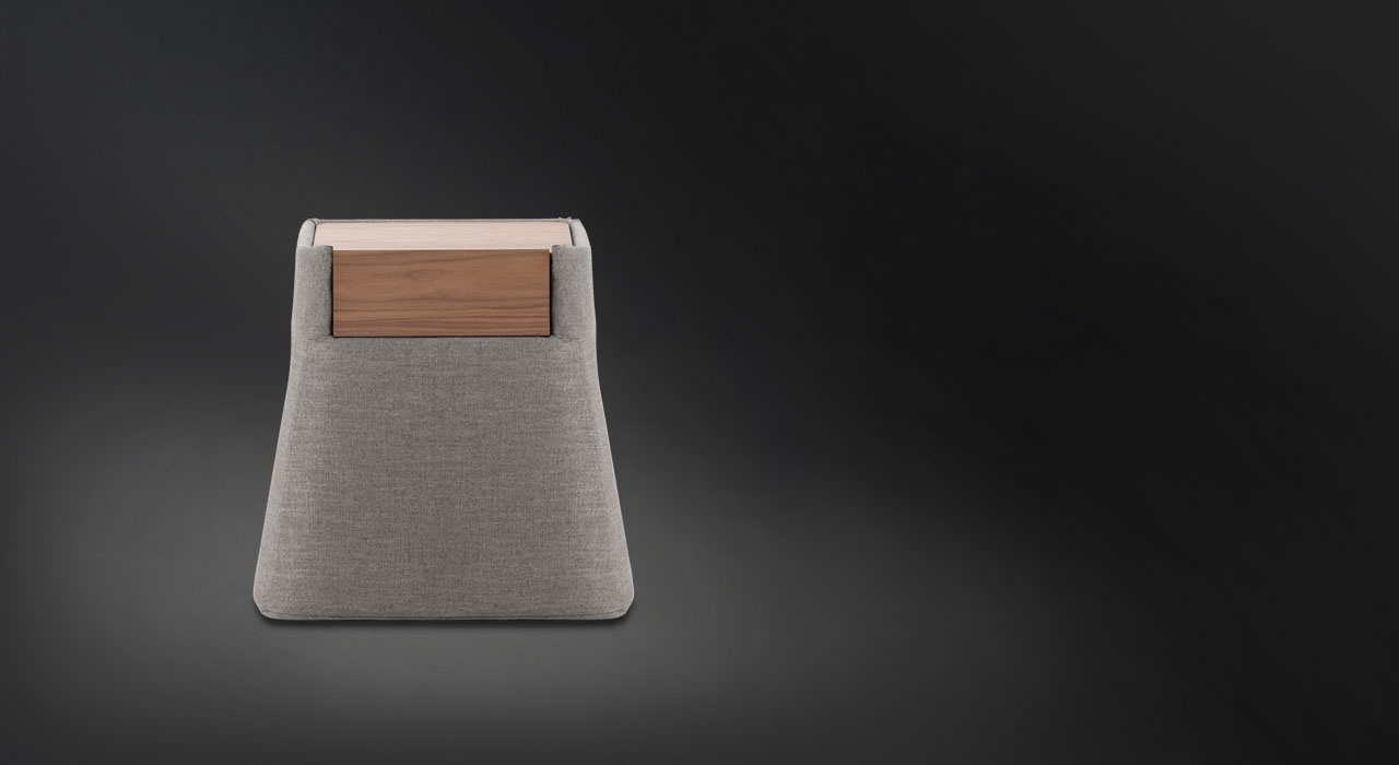 Bedside table Léon from the Italian manufacturer Flou. Bedside table with drawer. Fully removable covers can be in fabric or leather. The top and drawer front is walnut. The model is made in modern style.