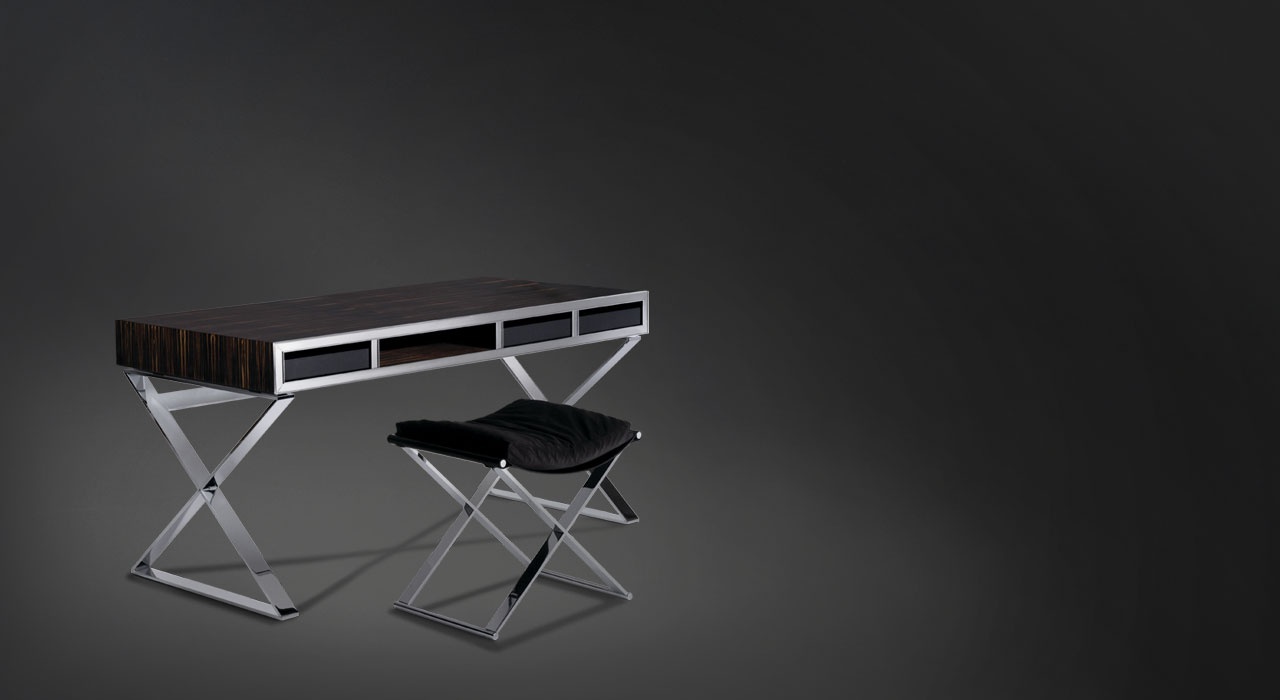 Desk Montenapoleone from the Italian manufacturer Flou. Legs - chrome steel. The facade of drawers: veneer ebony. Veneer is using large sheets of veneer to avoid visible joints on the surface. The model is made in modern style.