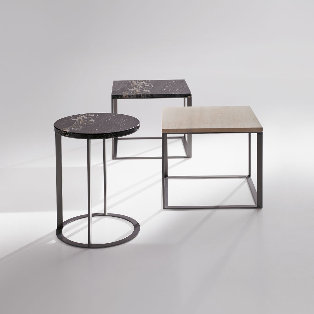 Pathos coffee table from the Italian manufacturer Maxalto. Marble top or MDF, finished with glossy varnish. Support structure: chrome-painted metal, bits of plastic. Colours in stock.