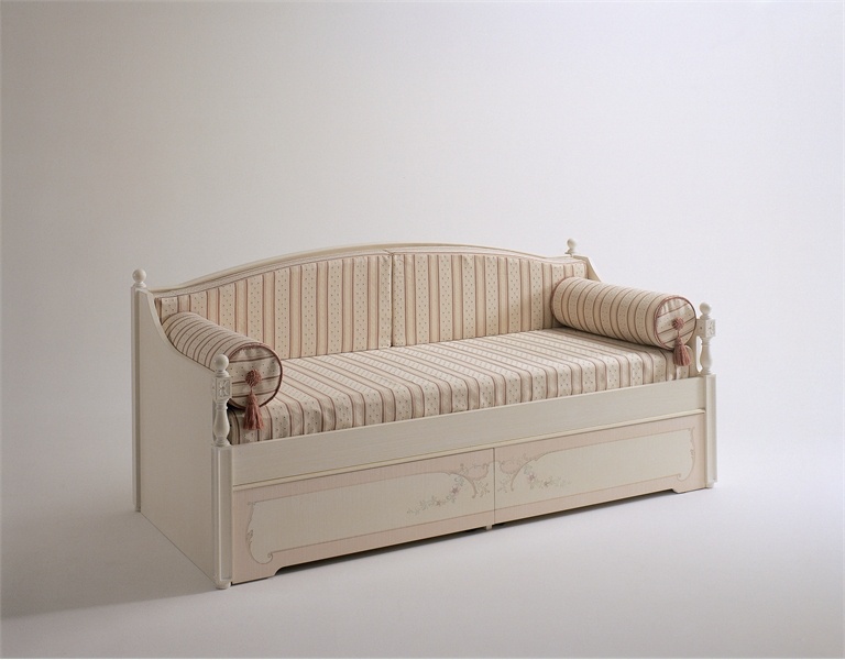 Pilar sofa from Italian manufacturer Pellegatta. Stylish sofa with tight back and armrests traditional silhouette. The frame of tamborito ate, which is a natural ceramic material with honeycomb on the basis of solid spruce. A carved backrest and armrests are embellished by columns with knobs. Two roomy drawers on wheels for bed linen. The surface is covered with a substance, which protects it from scratches and damages. Soft cushions, armrests, decorative piping and tassels, and seat in fabric; the backrest can be mitigated by cushions, repeating its contours. Model shown in color antique white; other colors available, as well as in the technique of painting miniatures from the catalog factory or zanaschka sketch, including the inscriptions in the Latin alphabet or the Cyrillic alphabet. All the finishes, including lacquer processing, carving and painting, is done manually by highly skilled craftsmen.