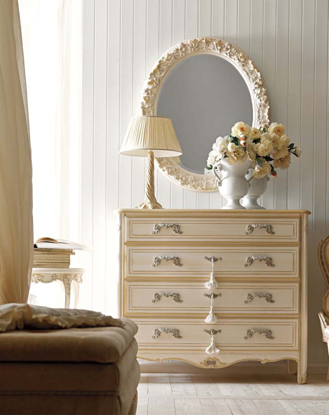 Set for bedroom Ambiente Notte from the Italian manufacturer Savio Firmino. Set consists of a double four-poster beds, benches with a niche for storage, bedside tables, chest, screens, mirrors. Frame products made of solid wood. Upholstery - textiles from the company portfolio. Filler - polyurethane foam. The ornament is represented in the form of thread, handmade. Wooden surface covered with lacquer and gold leaf. Colours in stock.
