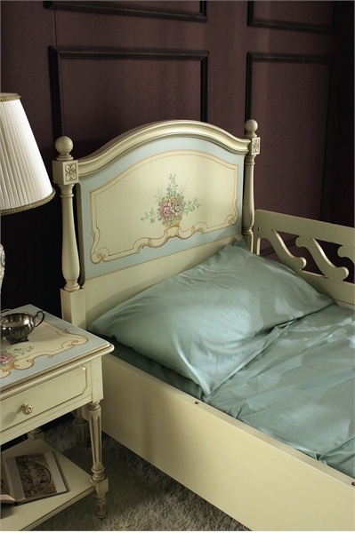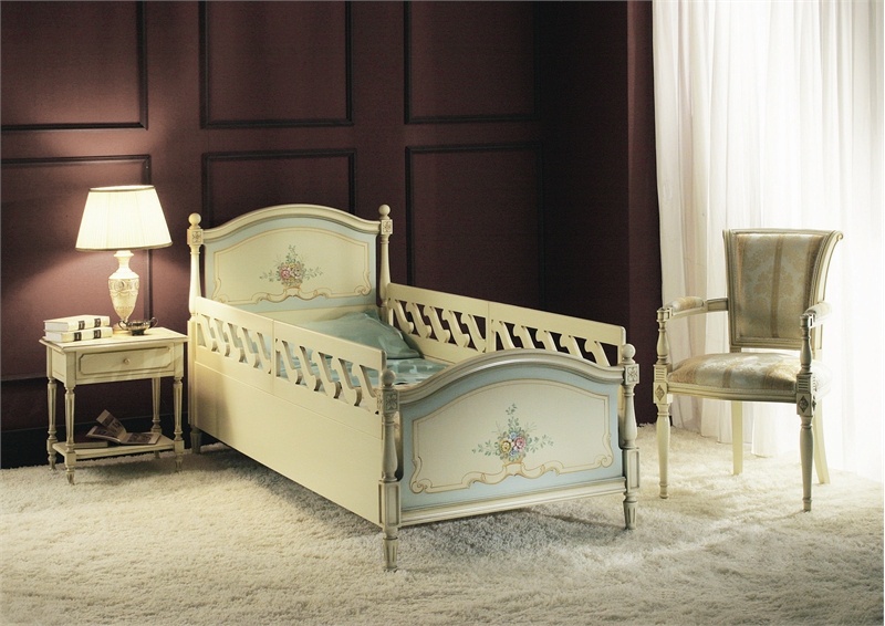 Letto bed from Italian manufacturer Pellegattа. Baby bed handmade. Model with removable patterned bumpers. The frame is made from tamburino, plate material with honeycomb on the basis of solid spruce. The legs and support bars of the headboard and foot end made from solid wood, ramino, decorated with carvings. Finishing is done manually with the possibility of staining can choose any color from the range or by a given sample. The model can be decorated with hand painting, a picture from a catalog of factory or according to customer. The surface is covered with a substance, which protects it from scratches and damages.