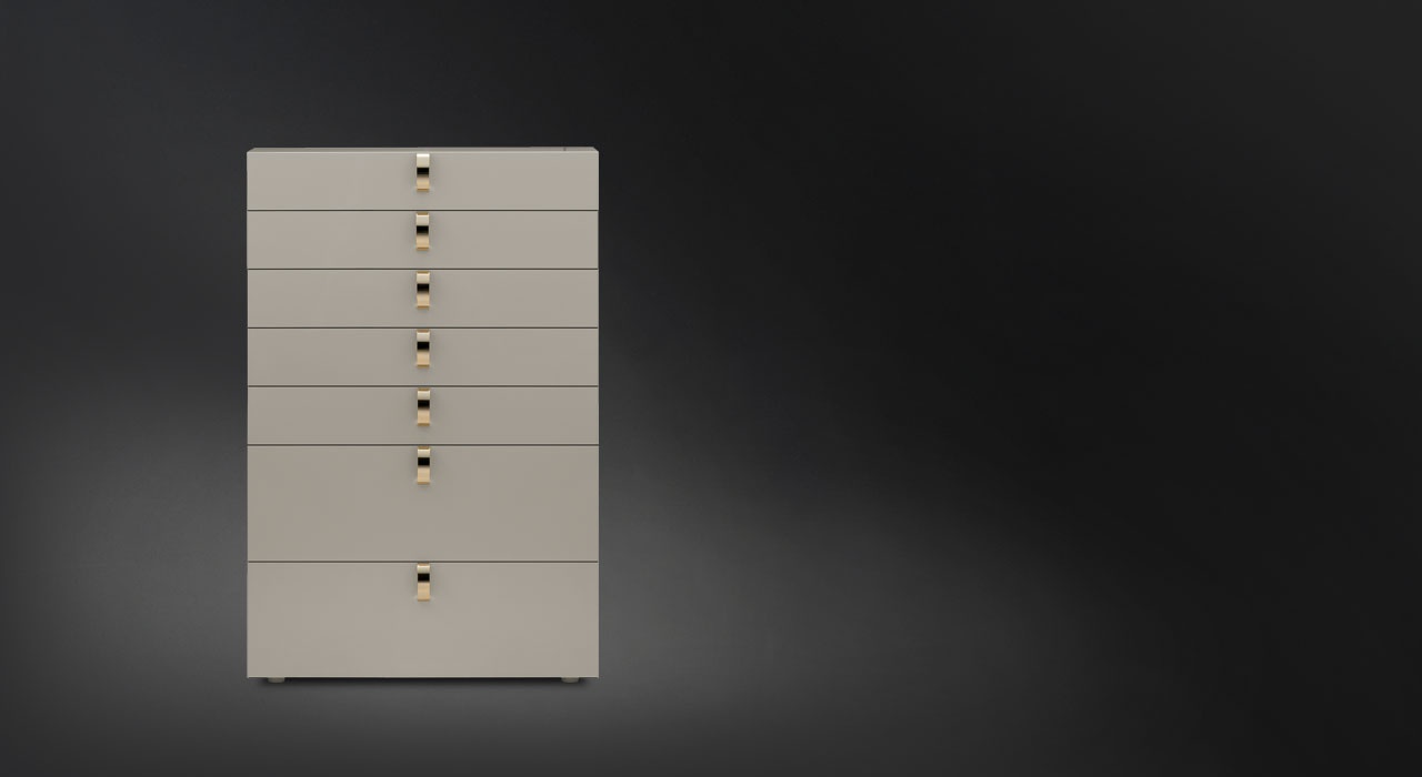 The Splendor of drawers from Italian manufacturer Flou. Model with cream lacquer finish. Handles: etched gold / black Nickel. A wonderful choice for the bedroom in modern style. Colours in stock.