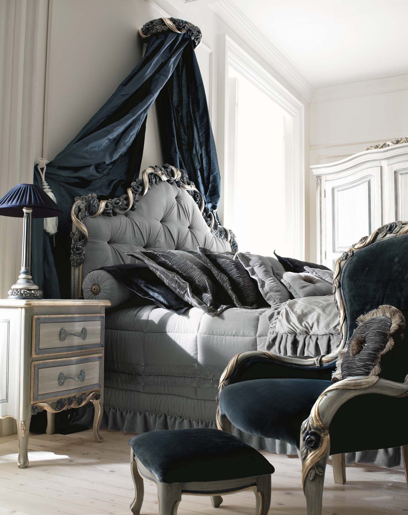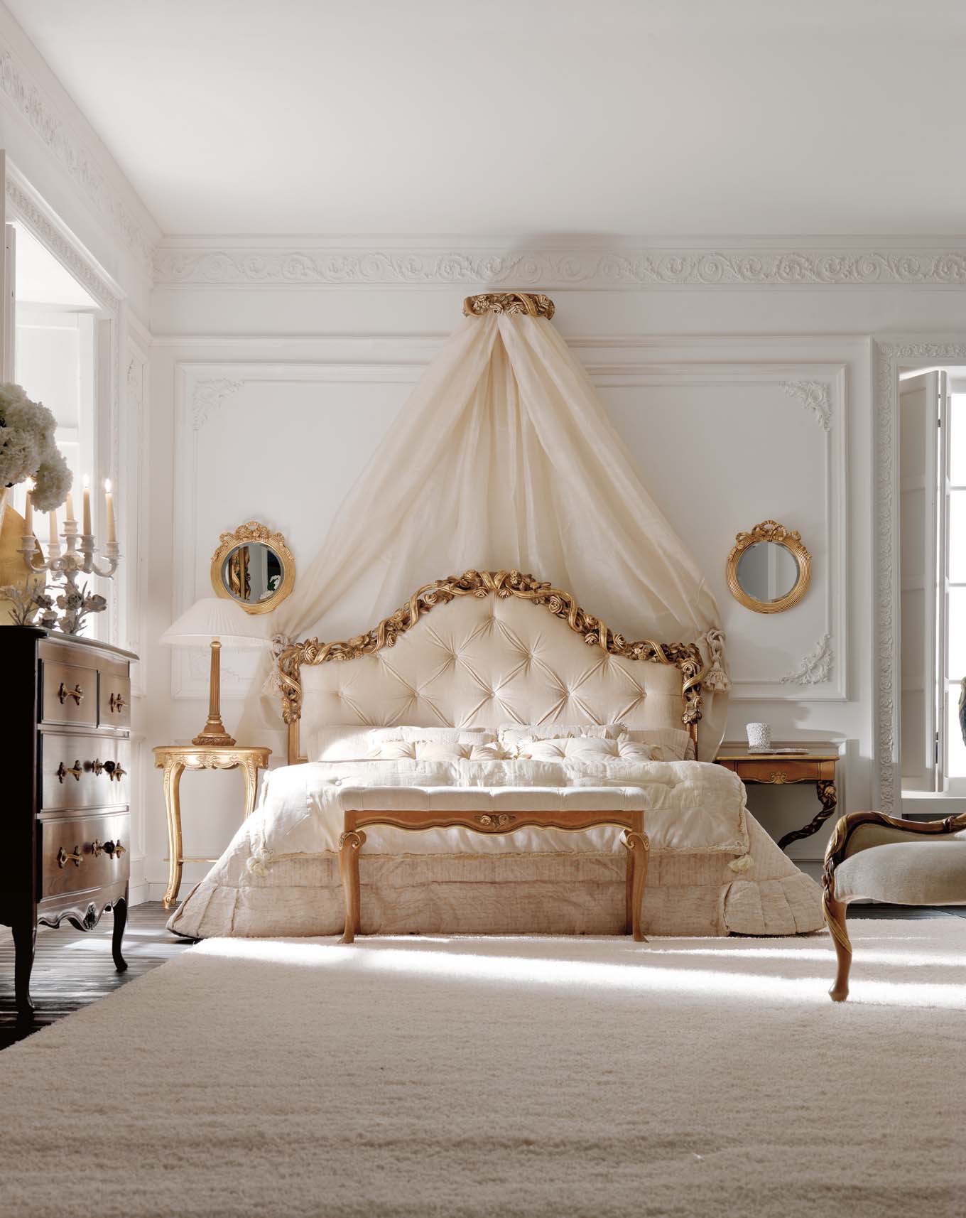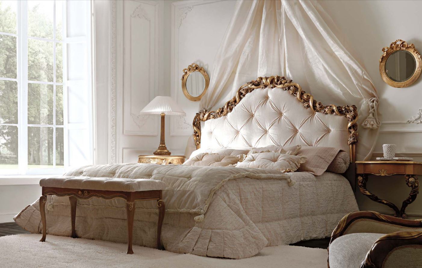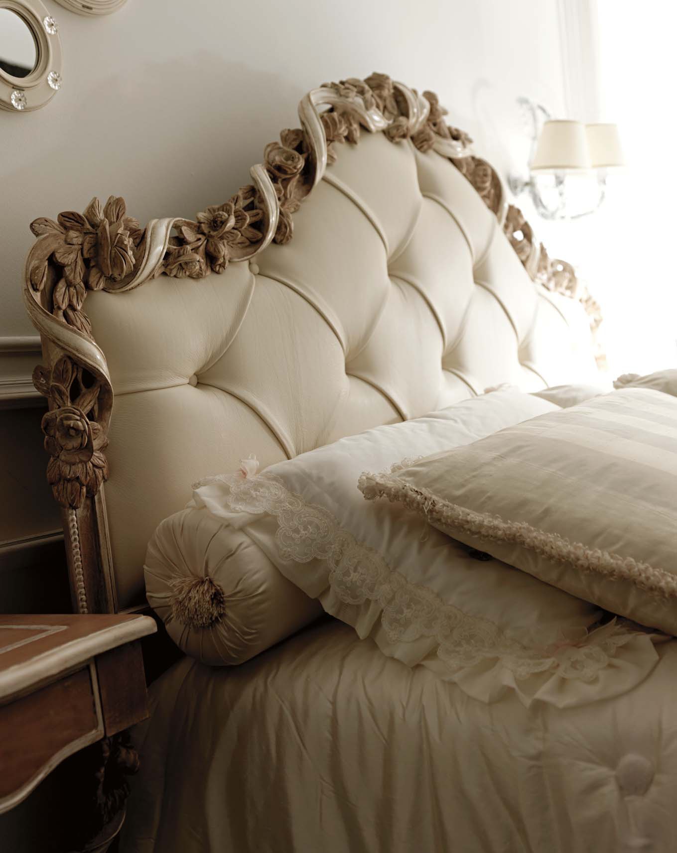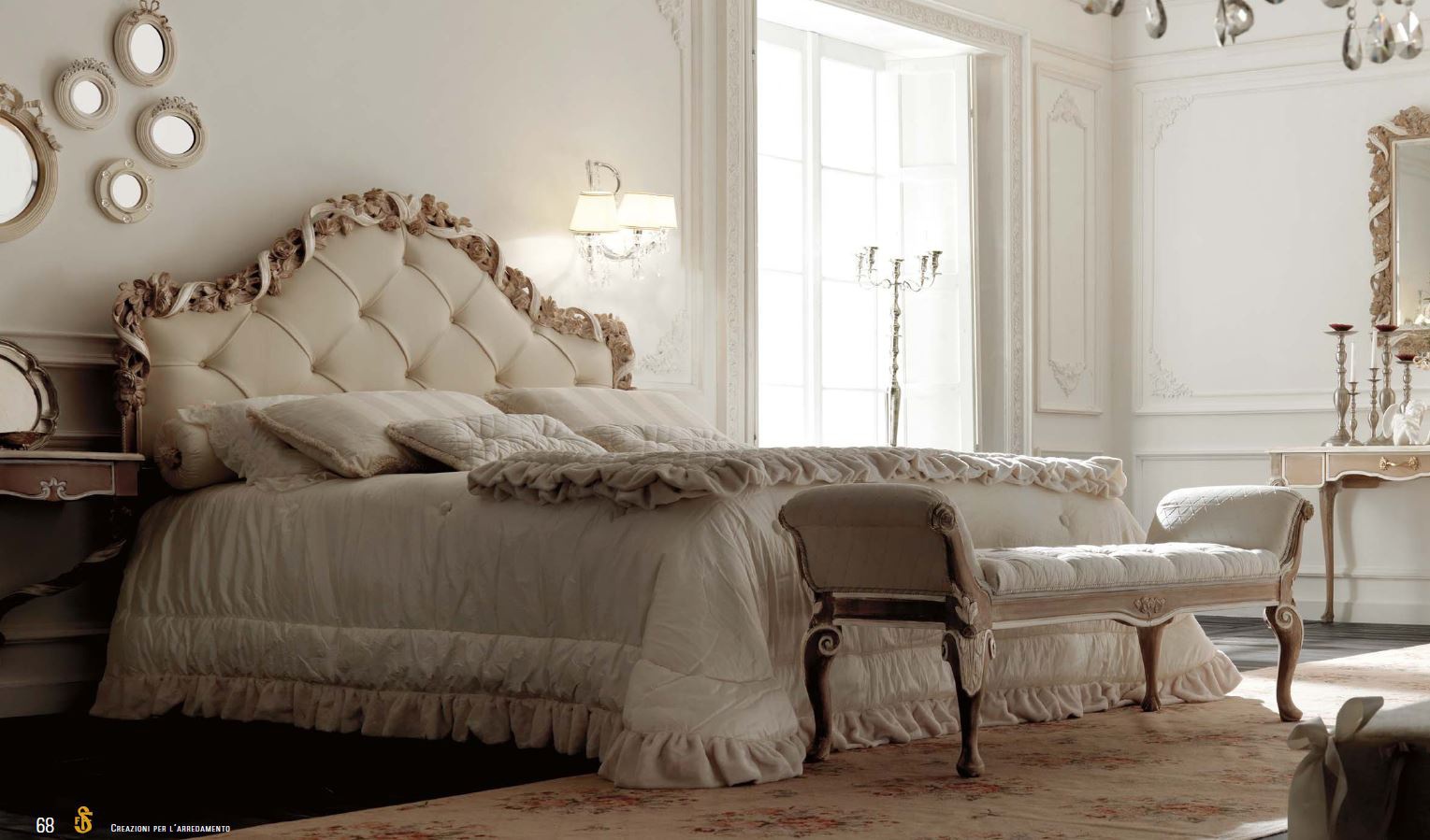 Double bed Ambiente Notte from the Italian manufacturer Savio Firmino. Bed on wooden frame. Upholstery - textiles from the company portfolio. Cover wooden surfaces with lacquer, gold leaf. High, upholstered headboard covered with high quality fabrics, adorned with buttons-Capito. The main decoration of stands rich in carving handmade. Color range is wide, according to the catalogue of the manufacturer. Style classic.