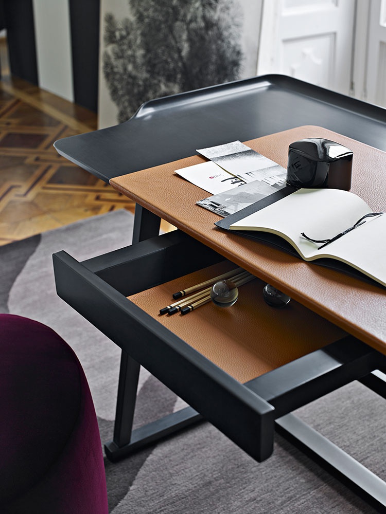 Desk Recipio from the Italian manufacturer Maxalto. The model is equipped with a small drawer. Superb proportions and fine details, the table-top round shape make this Desk extremely valuable. Base frame made of beech wood in the finishing varnish. Finishing legs in tight leather.
