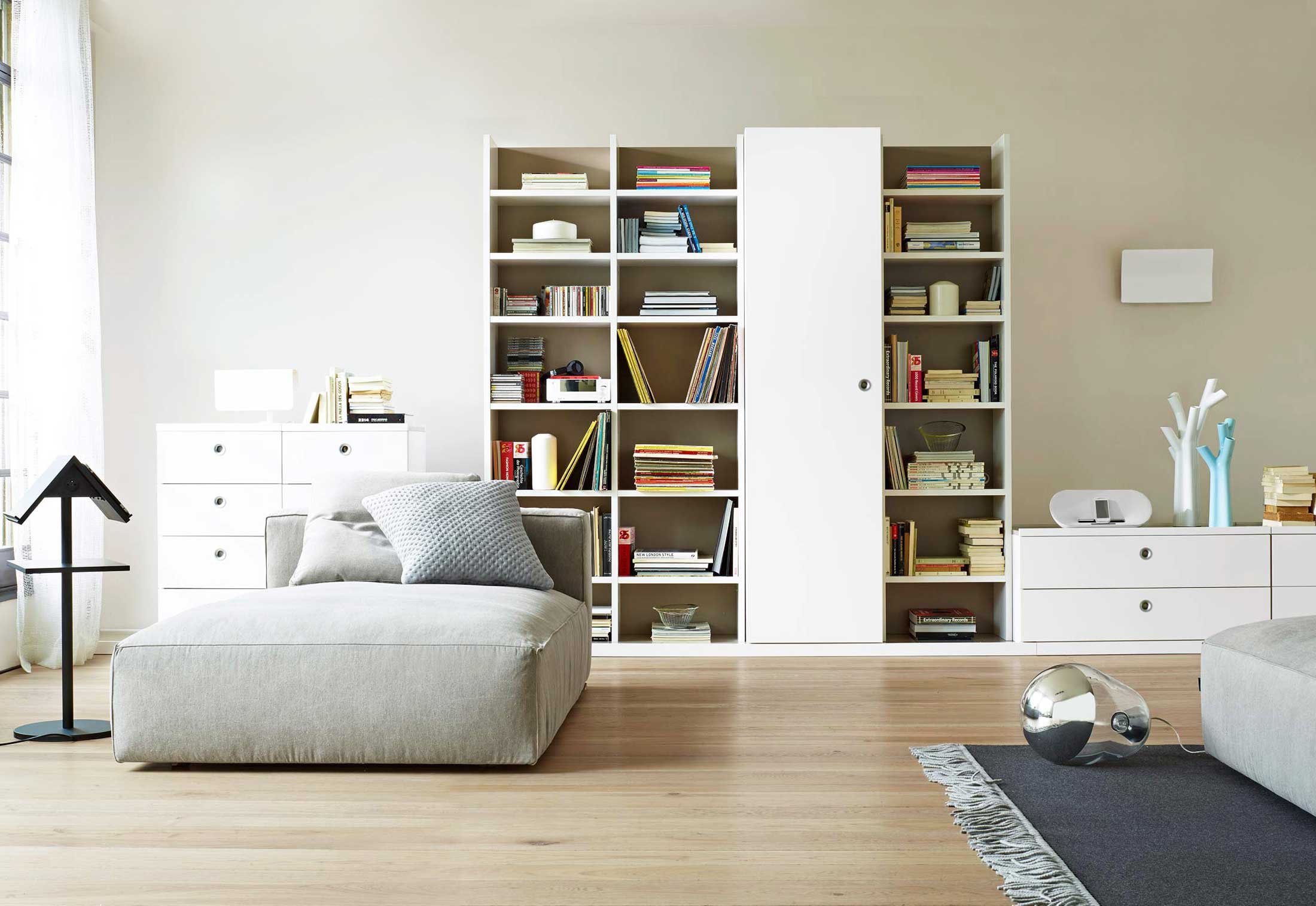 Modular system TARMAC from French manufacturer Ligne Roset. The series includes elements, covered with white clay and grey lacquer. Cabinets and separate bases covered with white lacquer, the upper part of low furniture items covered with clay-with grey lacquer panels, covered with white lacquer, a roller blind is suitable to the elements, covered with clay-gray lacquer. The platform has a wear-resistant coating of a laminate of a clay grey shade with panels, lacquered white. The handle is made of aluminium alloy, Matt chrome, with a flexible rubber insert. The bar for clothes made of polished stainless steel, the outer rod is coated with lacquer of a suitable color.