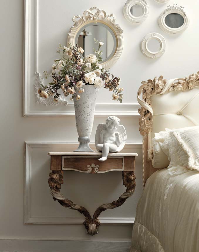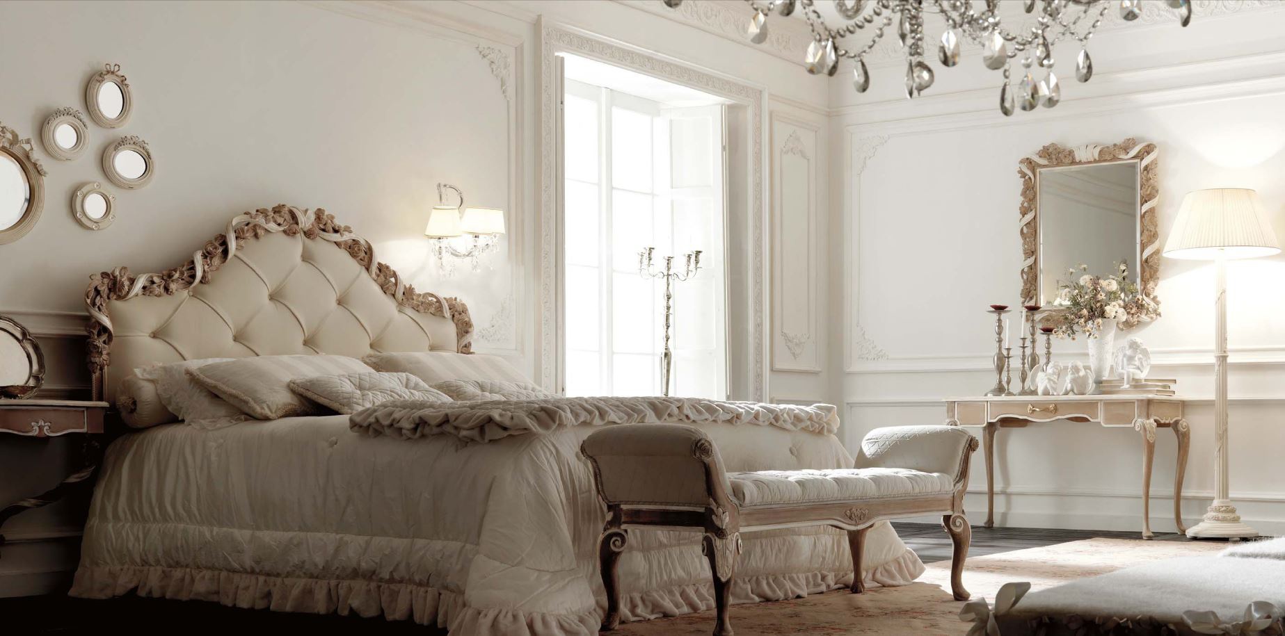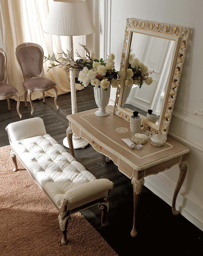 Set for bedroom Ambiente Notte from the Italian manufacturer Savio Firmino. Consists of double bed, bedside console, table, bench, dressing table, mirrors, chairs. Frame products made of solid wood. As decoration is hand carved, covered with gold leaf and artificially aged. Upholstery textile from the company portfolio. Accessories metal. Set made in a classic style.