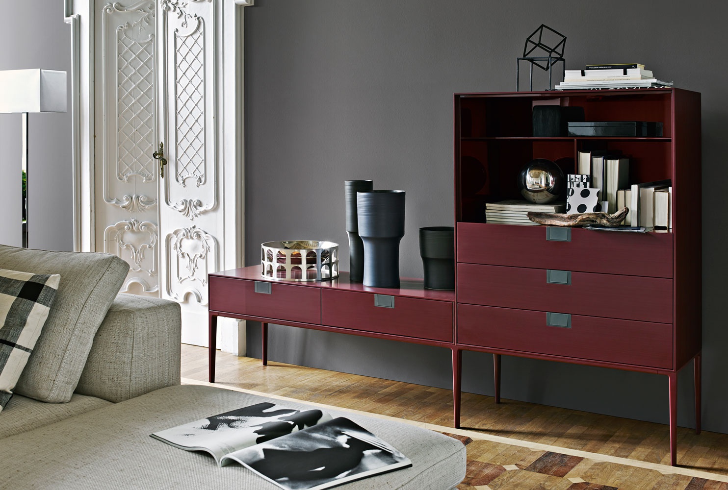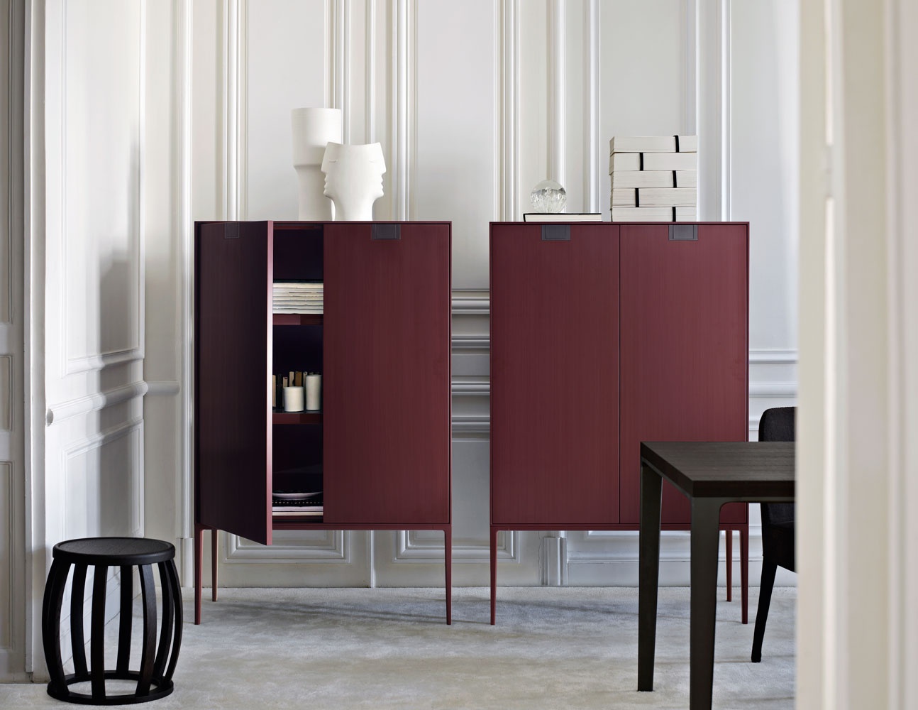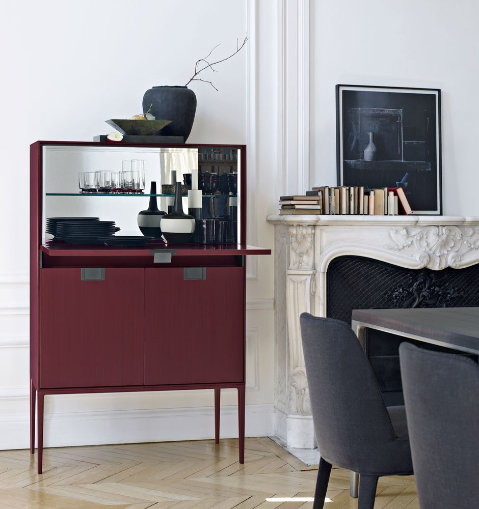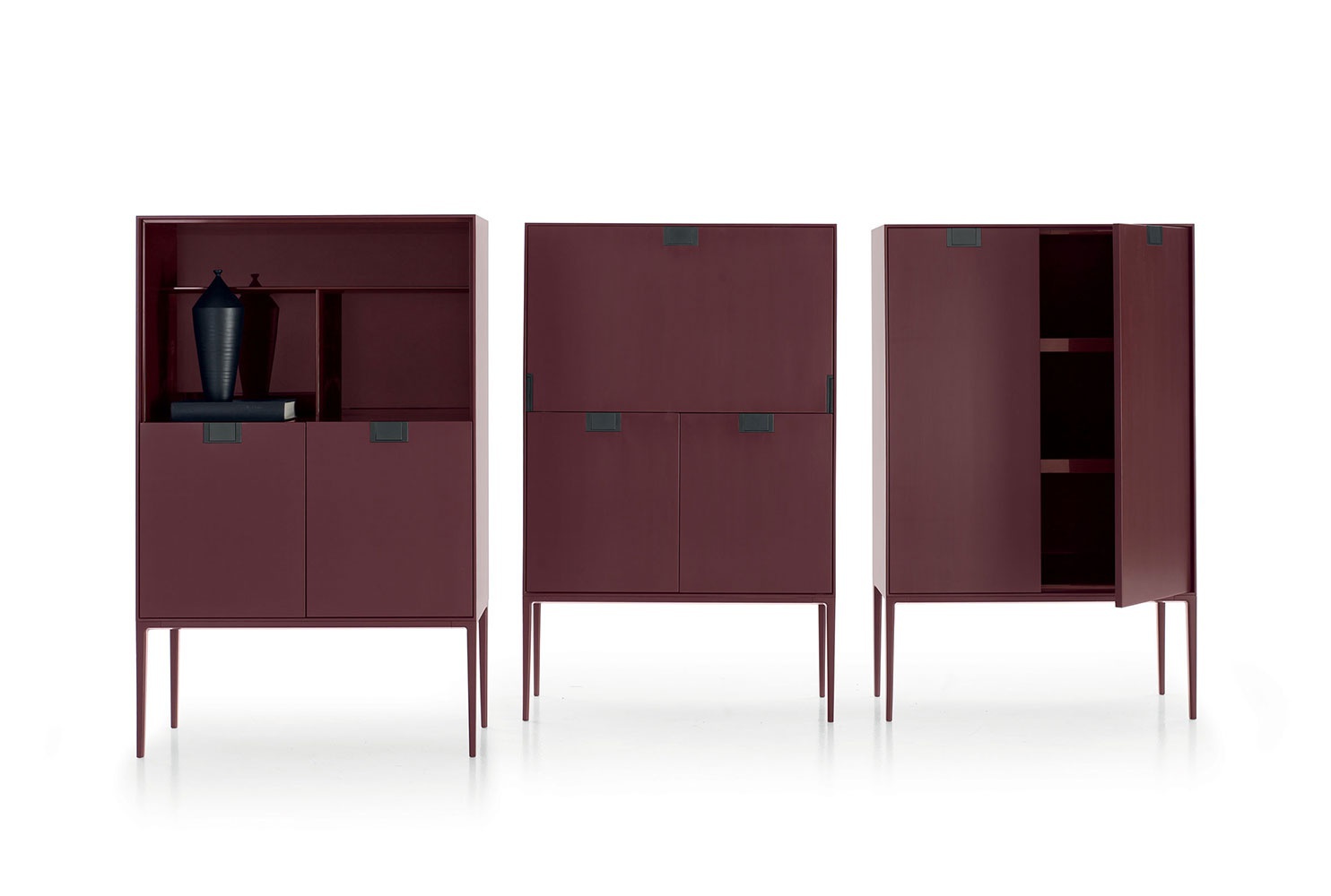 Cabinet Alcor from the Italian manufacturer Maxalto. Internal frame: painted MDF. Folding internal frame: reflective material. Drawer front: shellac. Handle and support frame: painted die-cast aluminium. Adjustable feet: thermoplastic material. Model for living room, hallway or office, will solve any storage needs. Available with double doors, closed or open version, in red and black.
