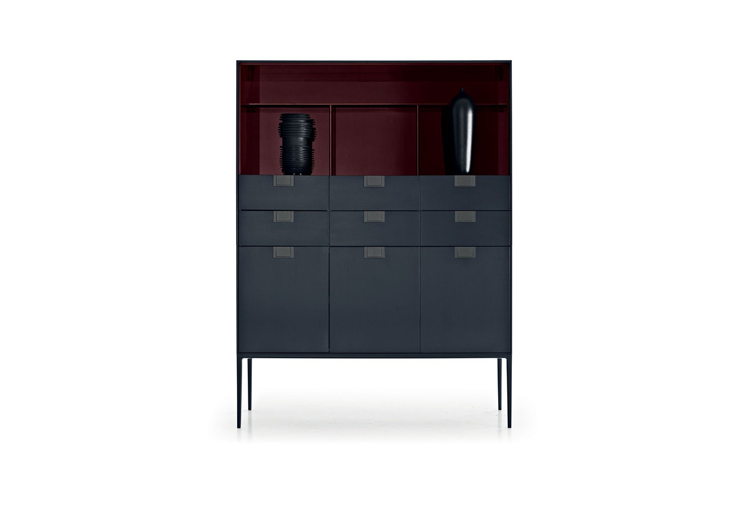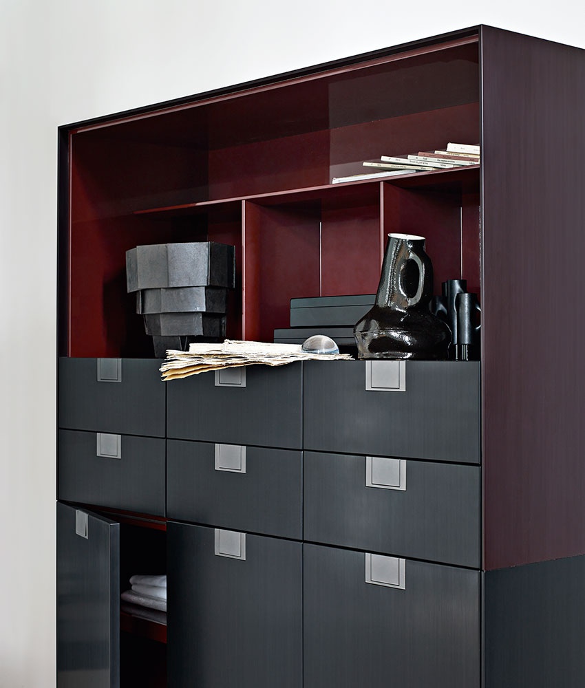 Cabinet Alcor from the Italian manufacturer Maxalto. Internal frame: painted MDF. Folding internal frame: reflective material. Drawer front: shellac. Handle and support frame: painted die-cast aluminium. Adjustable feet: thermoplastic material. Model for living room, hallway or office. In red and black.