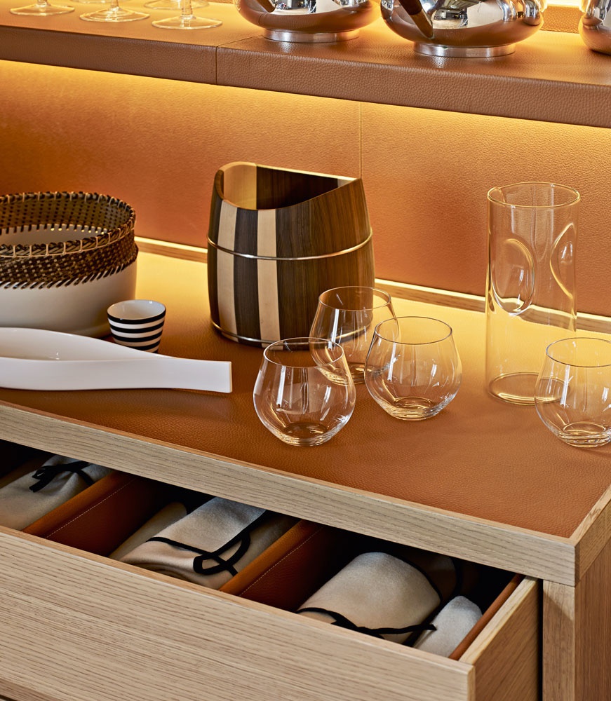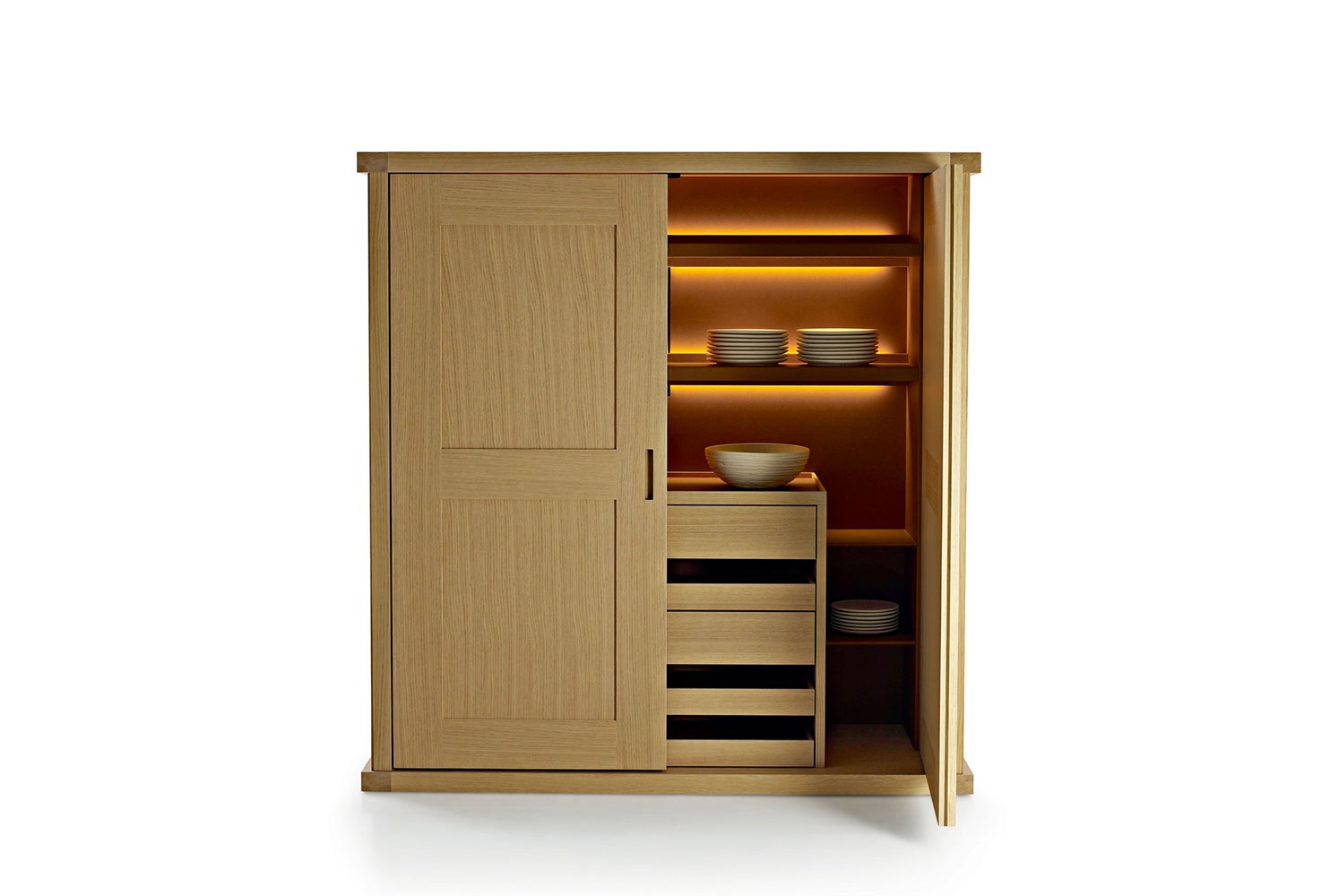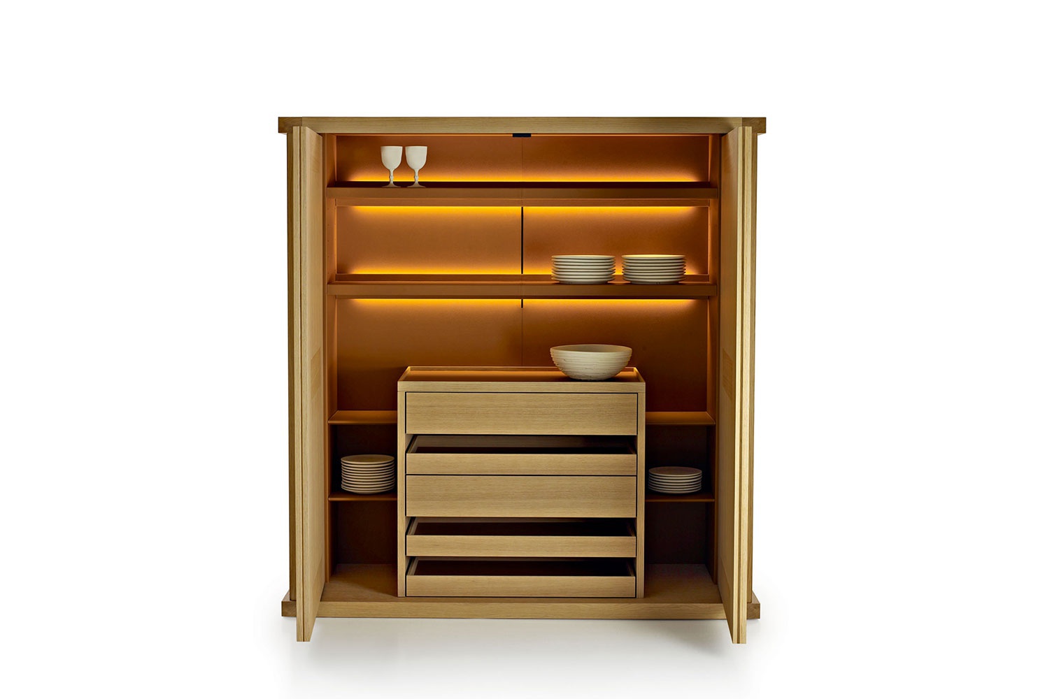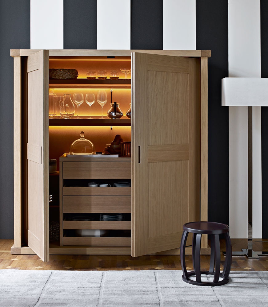 Cabinet Convivium from the Italian manufacturer Maxalto. Body: solid wood, oak, plywood. The top and bottom shell: solid wood, oak, plywood. Back panel: wood panel trim skin. Lighting system - led strip 12V DC 4000K, input voltage 220-240V 50HZ, maximum power 60 watts. Colours in stock.