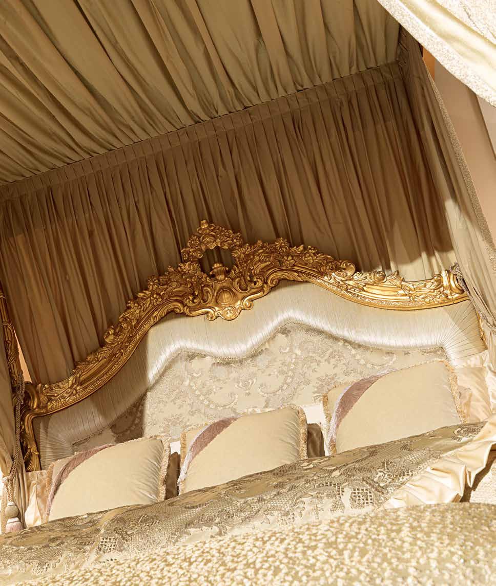 Double bed Charlene Italian manufacturer Zanaboni. Presents a model of four-poster beds. High headboard with decorative curly elements. A beautiful combination of beige and Golden. Will perfectly complement a bedroom in Baroque.