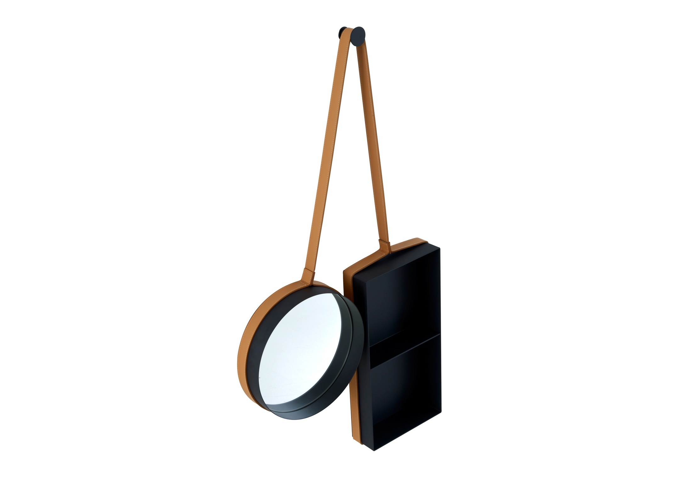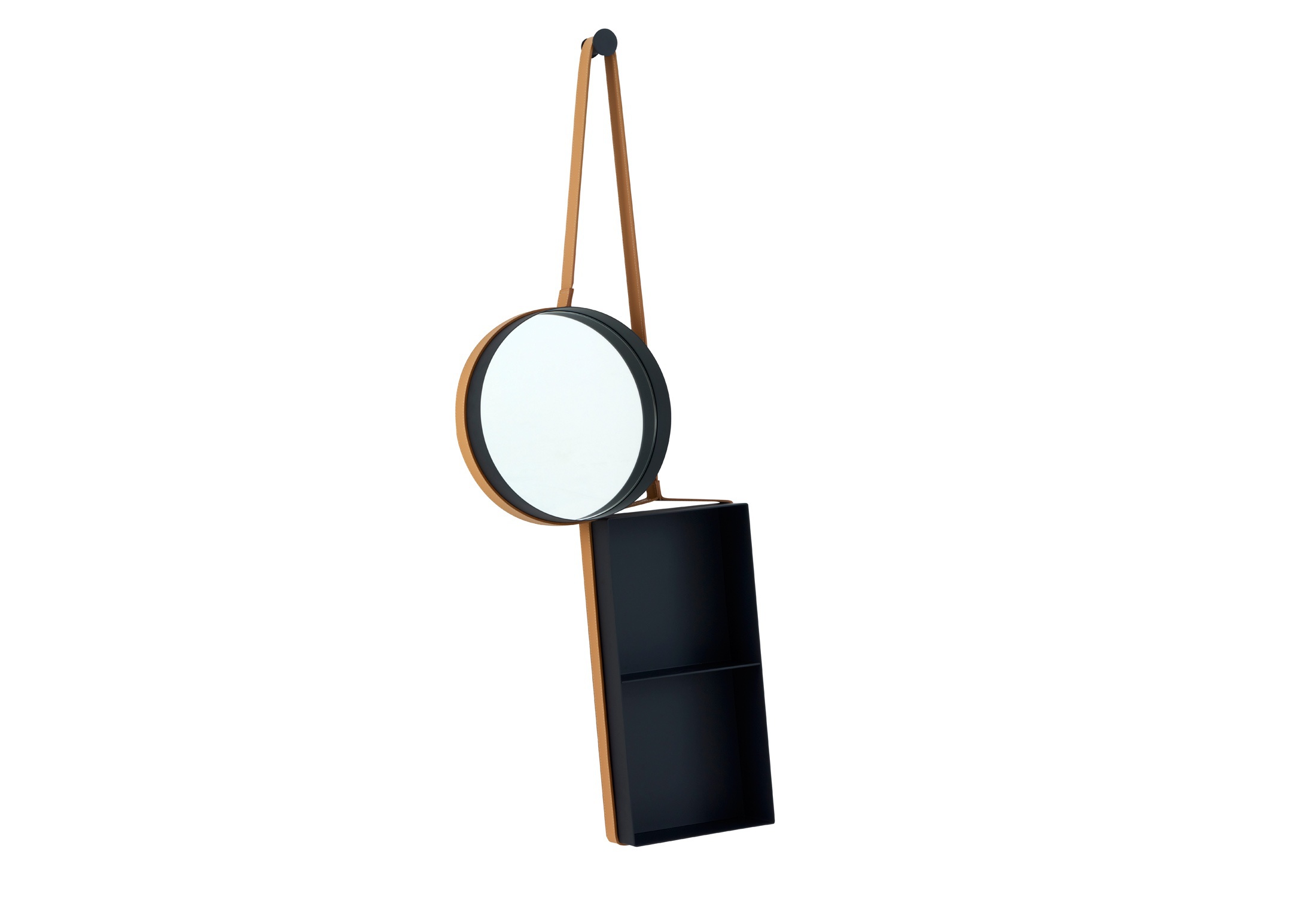 Wall VANITY mirror SHELF French manufacturer Ligne Roset. Mirror with storage shelves, hanging on one leather strap on the nail. Each element takes its place, based on the other. The mirror can be used as a mirror with a shelf in the hallway or in the bathroom. The model is made in modern style.