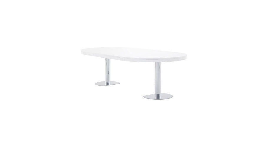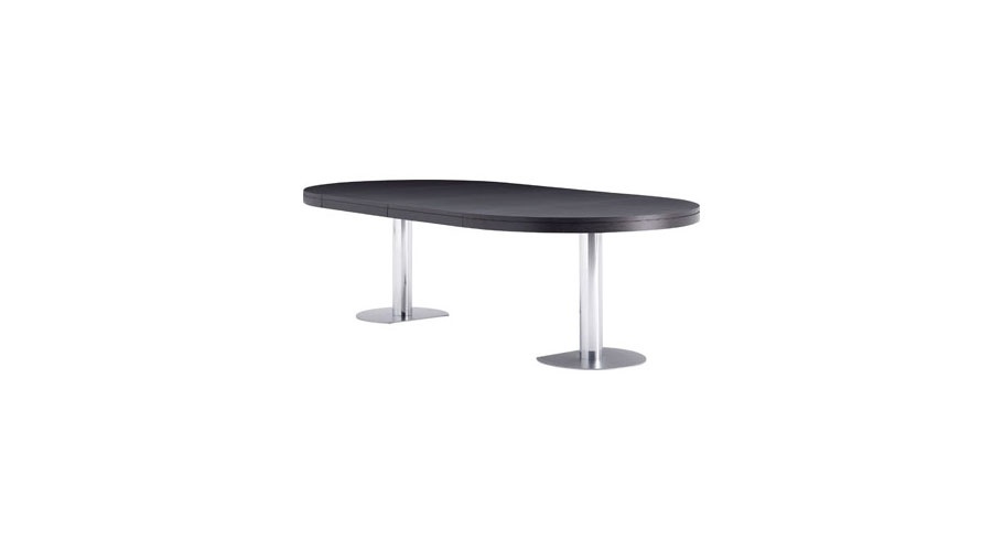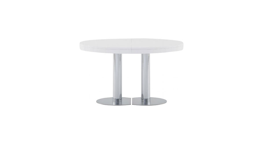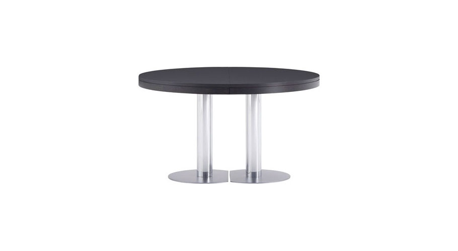 Dining table CRAFT from French manufacturer Ligne Roset. A round dining table. Insert for extension by 60 cm. the Basis consists of two sliding elements, each of which is attached to one of the semicircular parts of the tabletop. The legs are made from chromed steel. Support legs – matte chrome-plated steel. Countertop: oak, stained ebony, or glossy white lacquer. The model is made in modern style.
