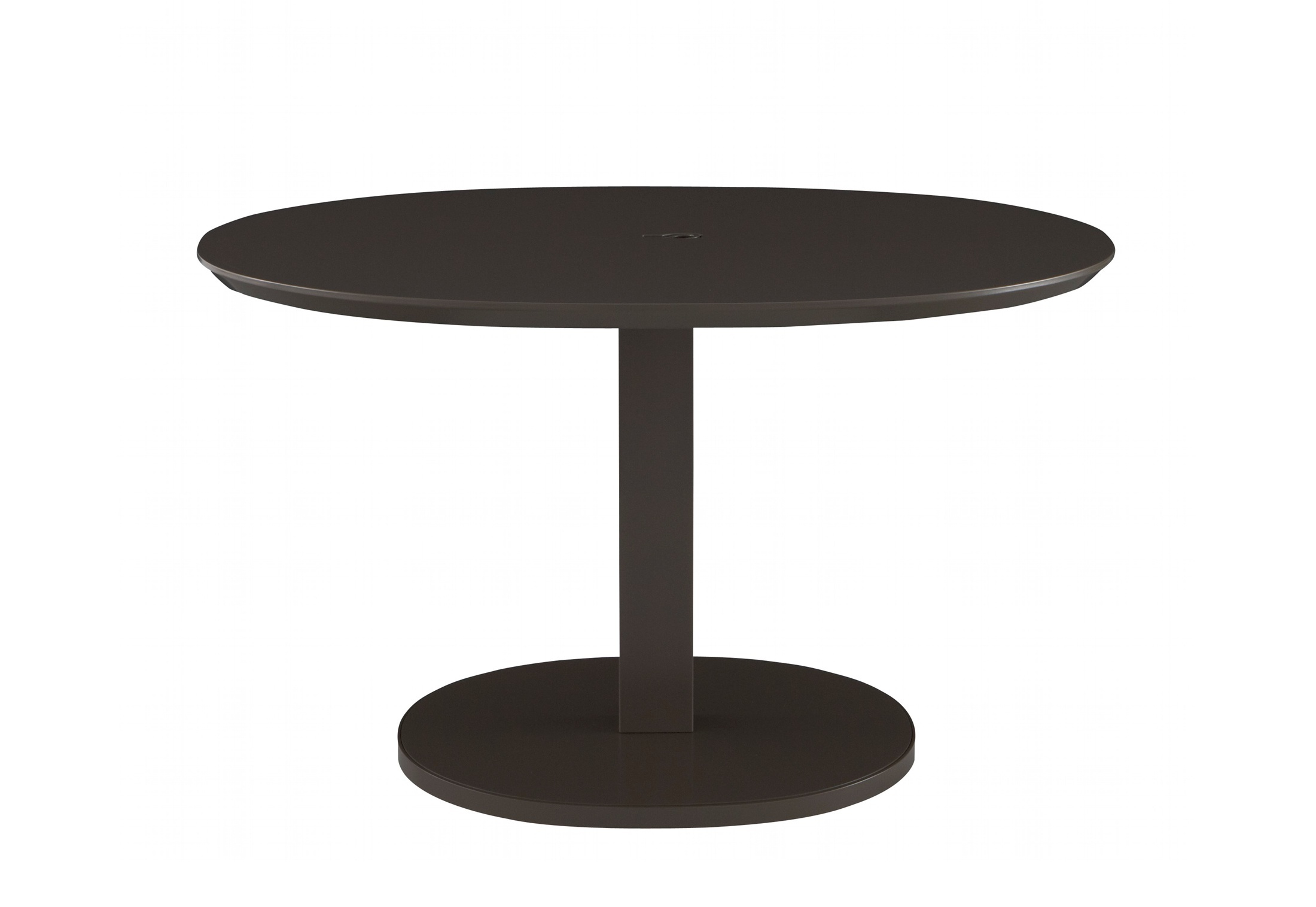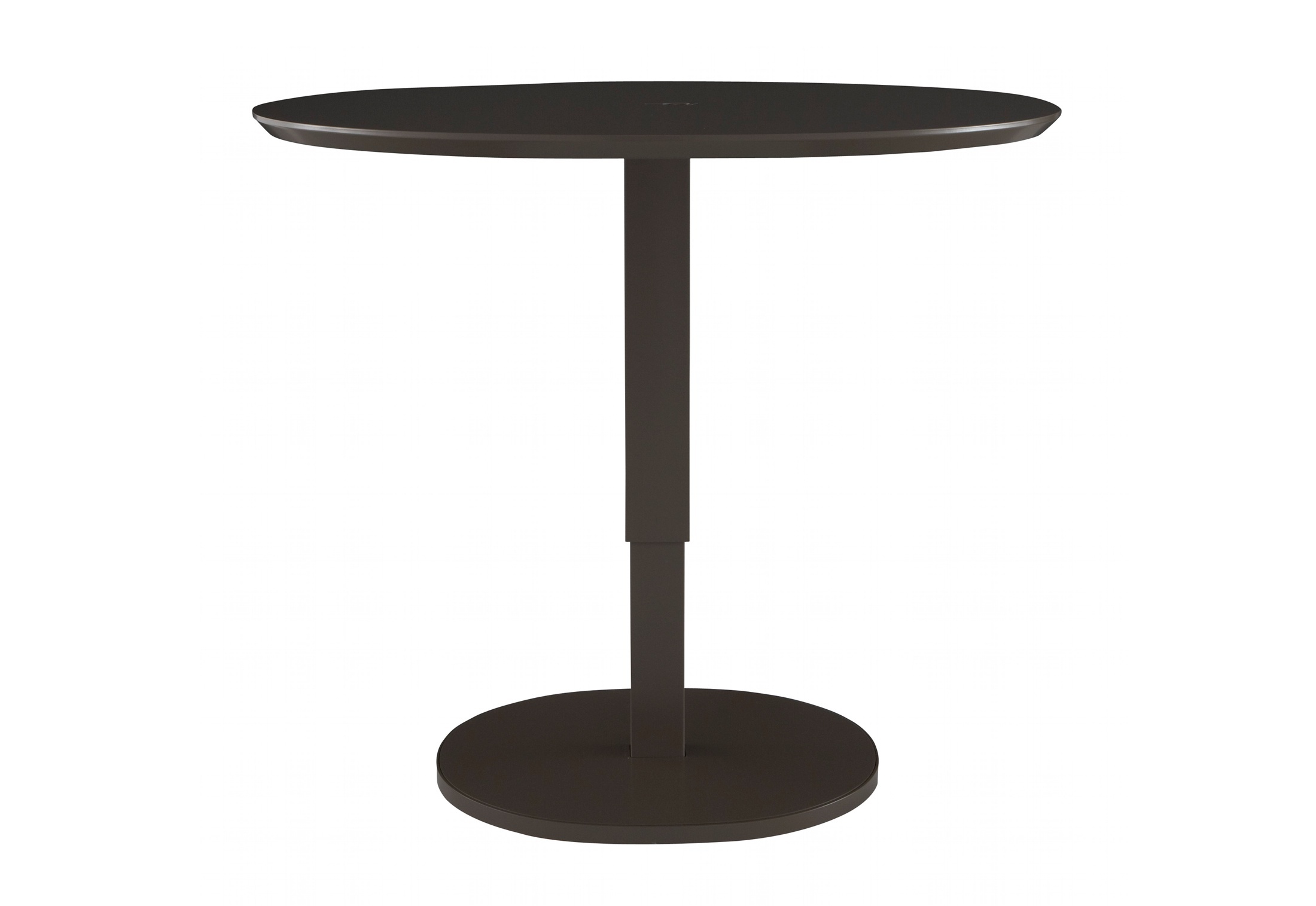 Dining table, GRANDE LUNATIQUE from French manufacturer Ligne Roset. Height adjustment occurs by means of pneumatic springs. Base and table top covered with melamine for greater durability of the product, available colors: black, clay beige or dark gray-brown. The leg is painted in the appropriate color. Table top thickness 23 mm, has rounded edges. The model is made in modern style.