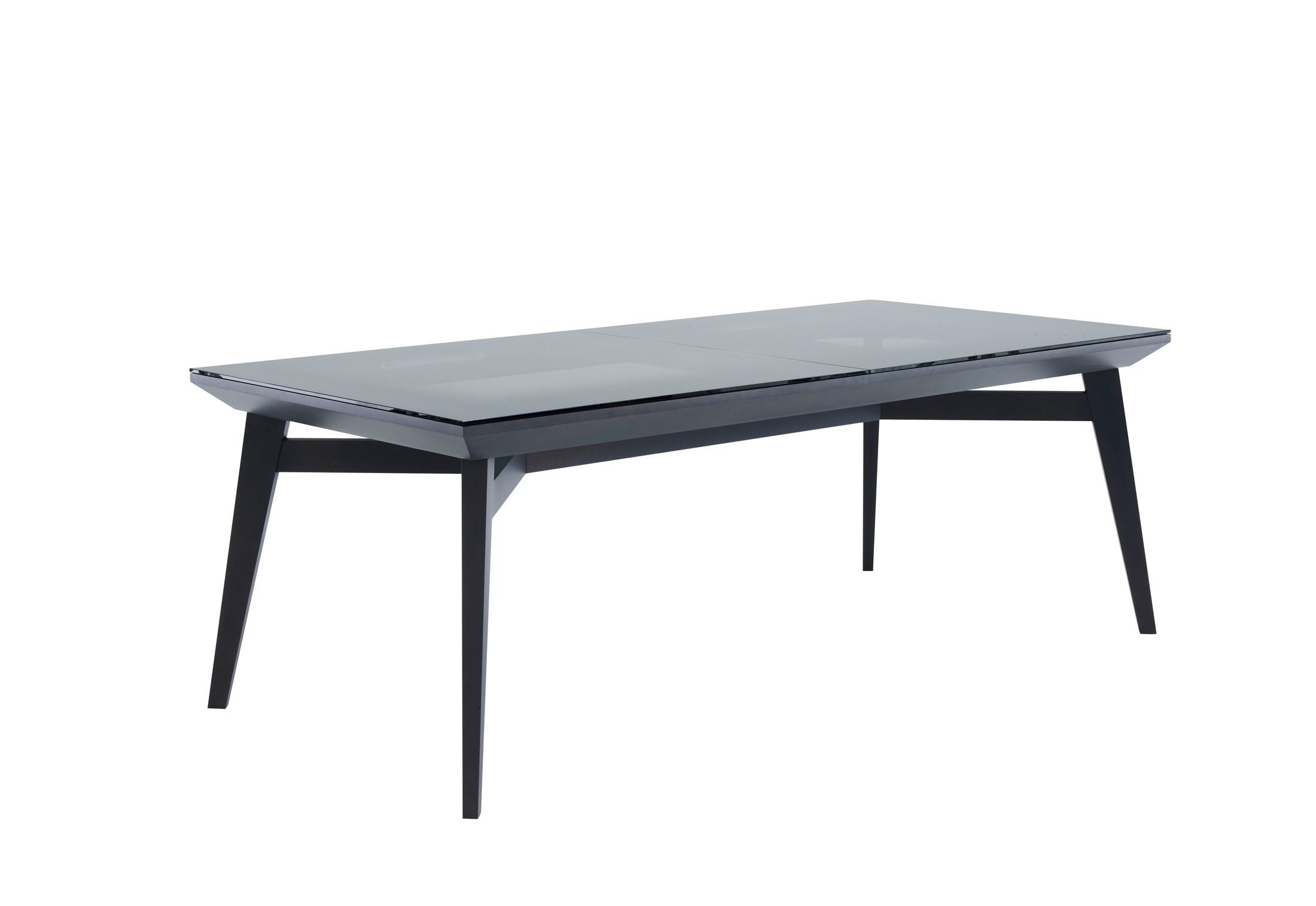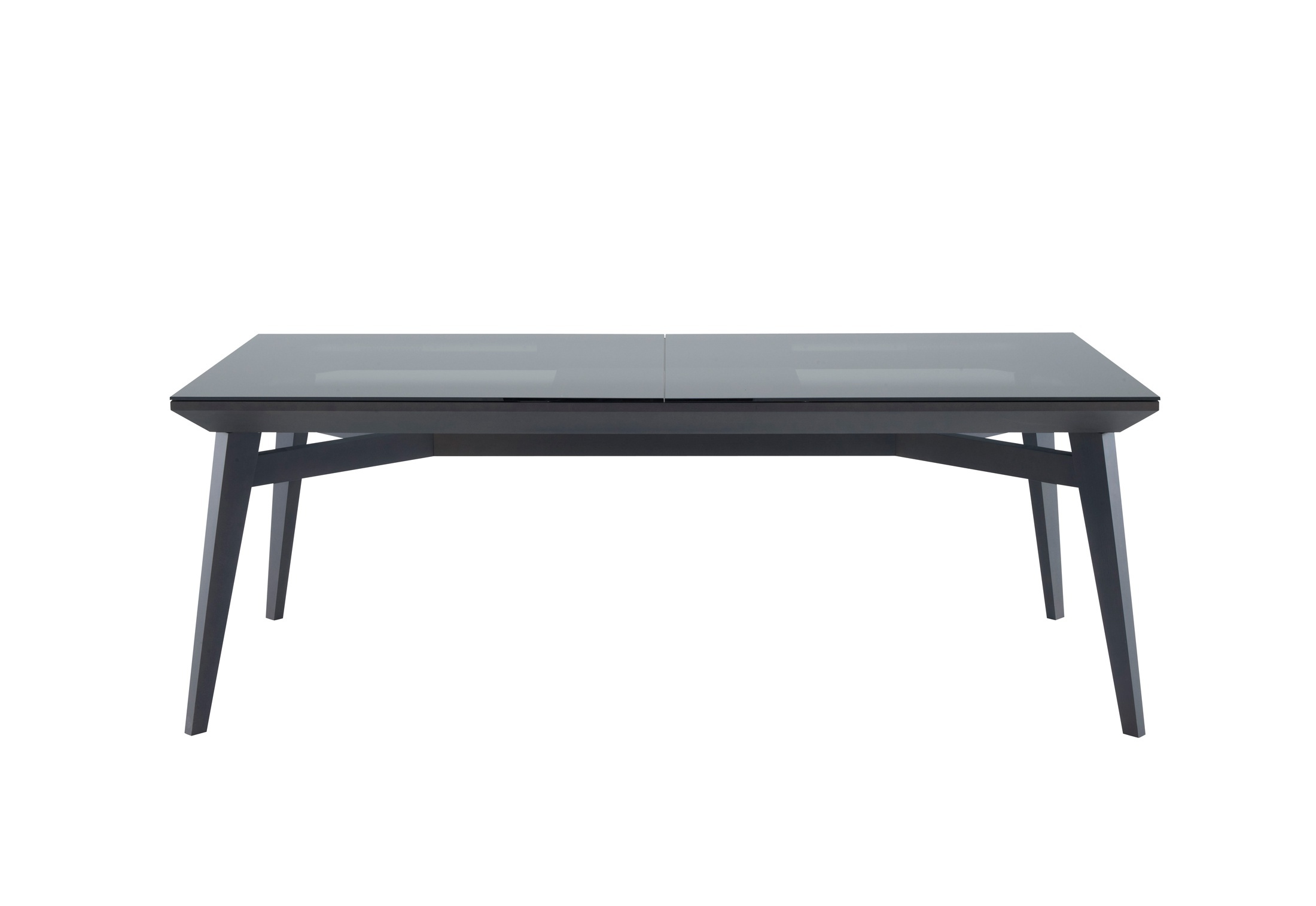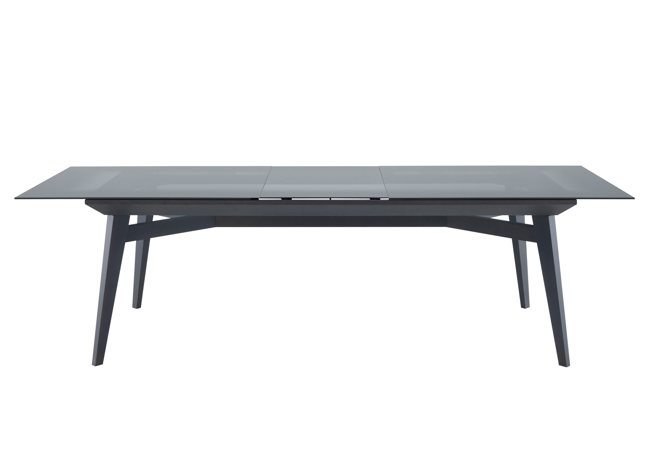 RACINES dining table from French manufacturer Ligne Roset. The top of tinted tempered glass, easy to care for, and its transparency allows you to see the elegant lines of the framework of solid ash, natural or stained in shade black color: eyes open four graceful legs in the style of 50-ies with the crossbar in the middle and two branches. The model is made in modern style.