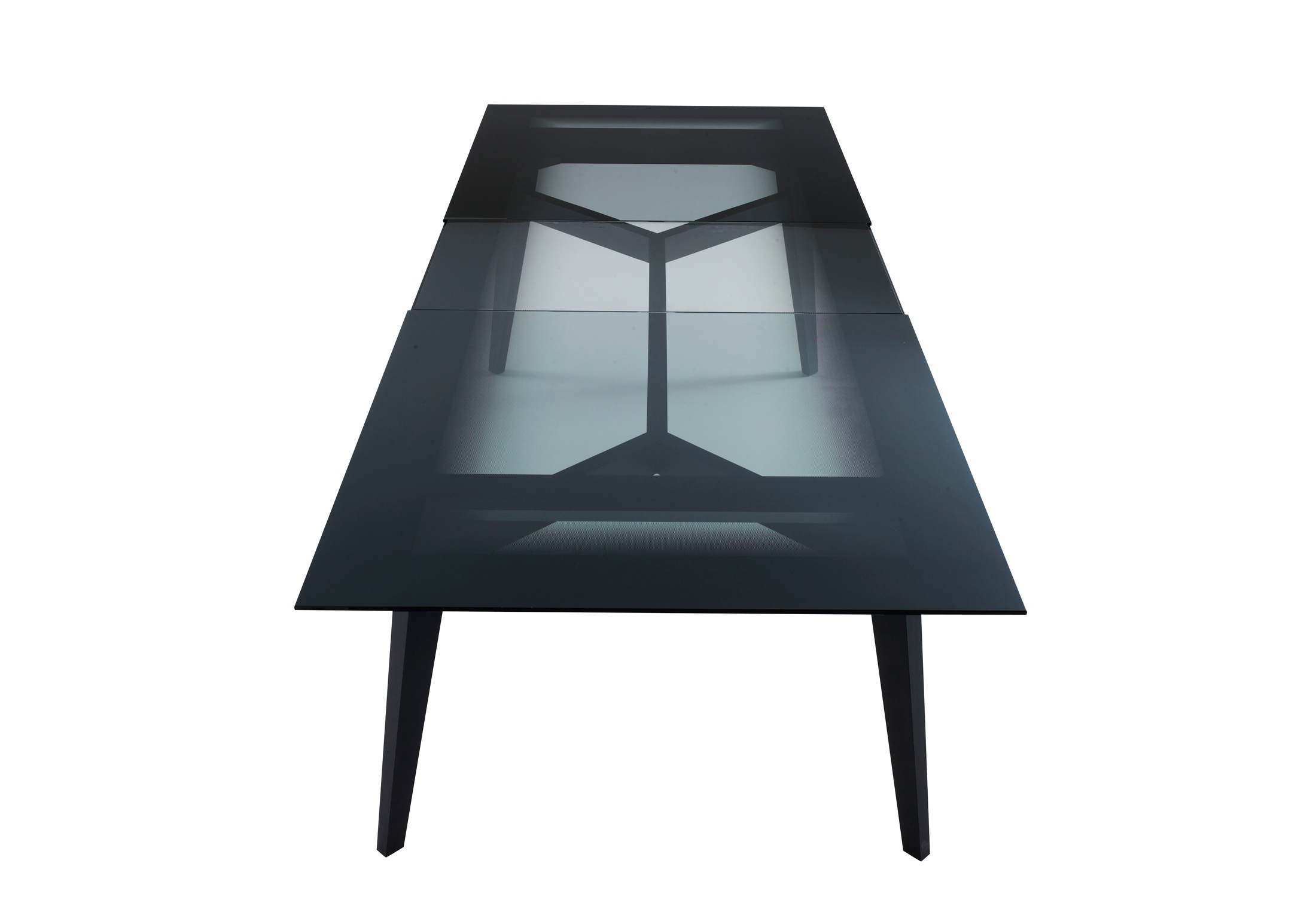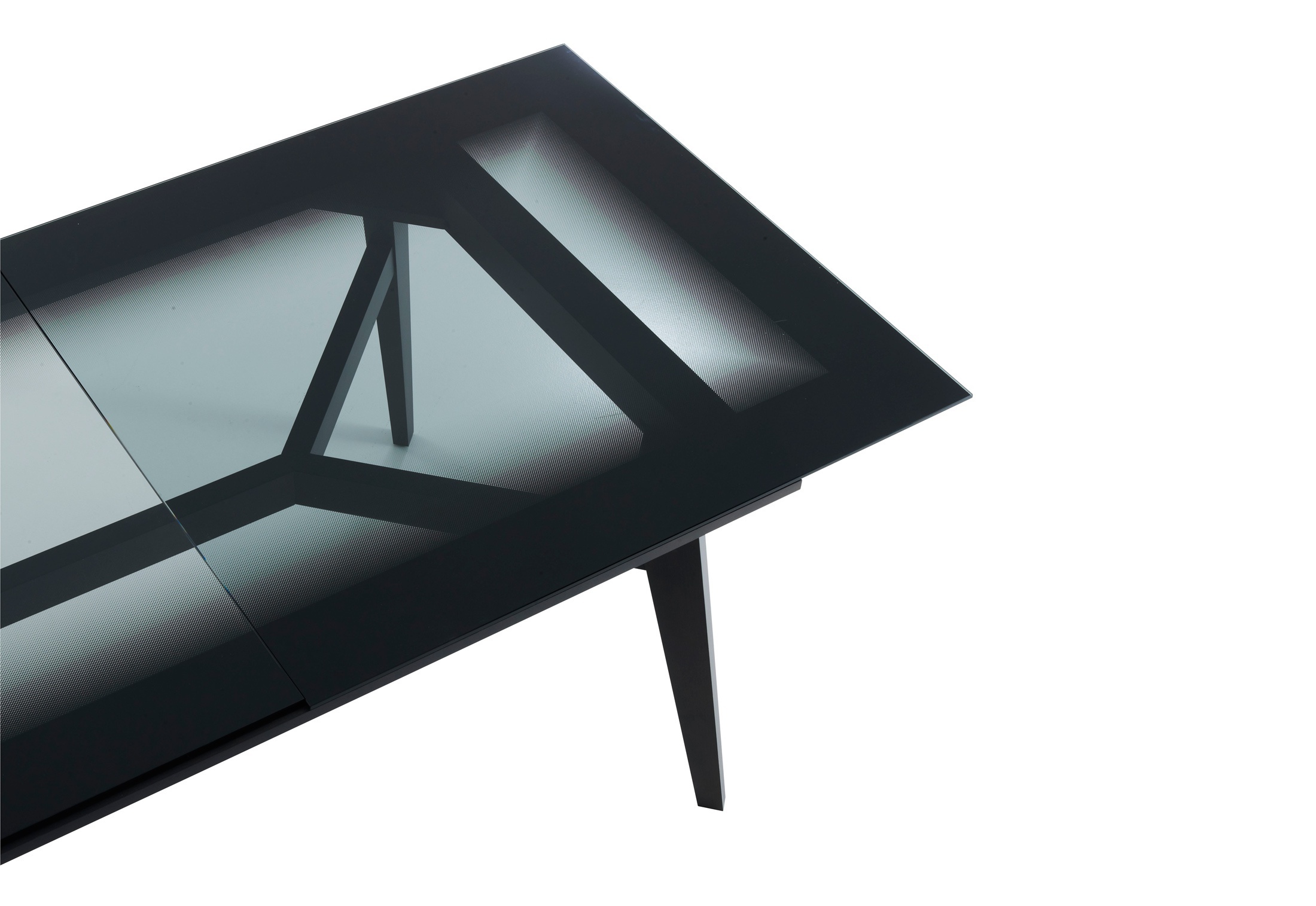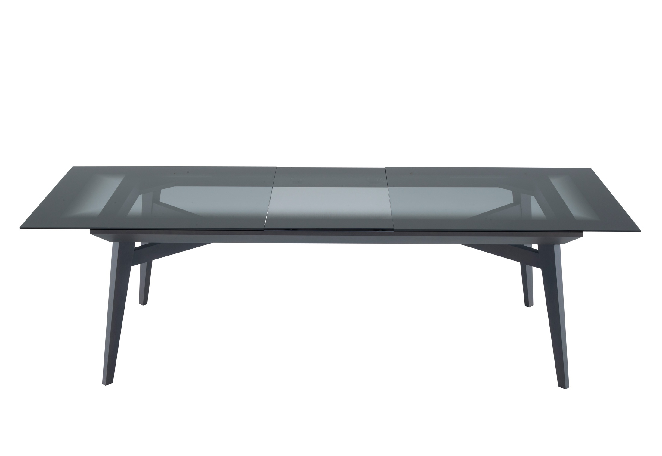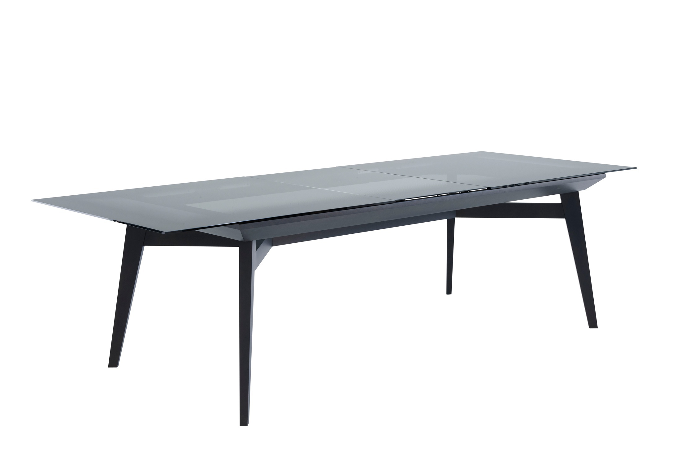 RACINES dining table from French manufacturer Ligne Roset. The top of tinted tempered glass, easy to care for, and its transparency allows you to see the elegant lines of the framework of solid ash, natural or stained in shade black color: eyes open four graceful legs in the style of 50-ies with the crossbar in the middle and two branches. The model is made in modern style.