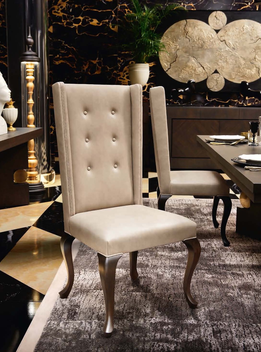 Chair with leather upholstery on beech legs Clelia from the Italian manufacturer Smania. The model is made in art Deco style. The frame is made of wood, upholstery - textiles or leather of your choice. Curly legs made from beech. Colours in stock. Clelia chair is incredibly comfortable with its soft seat and backrest. This chair is suitable for living room and dining room.