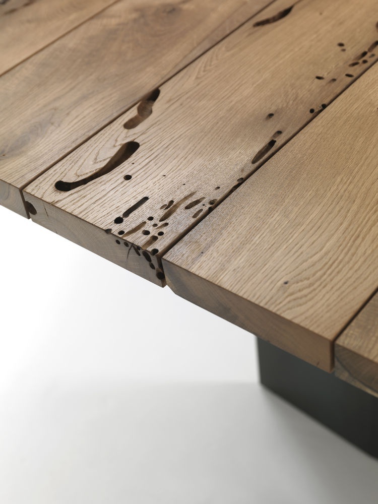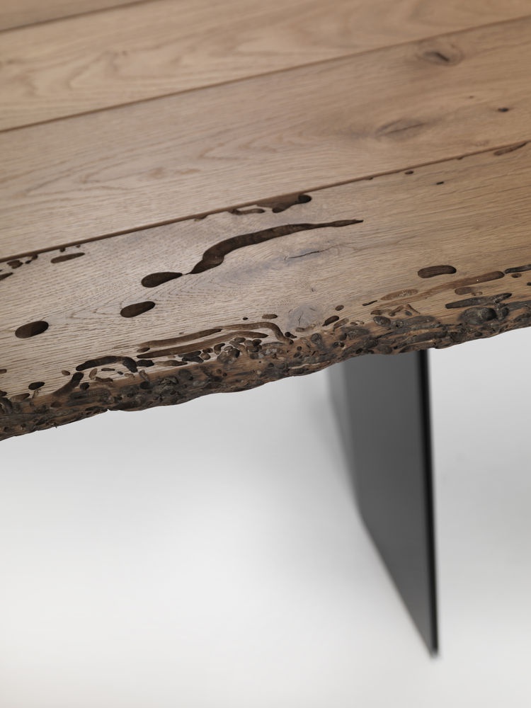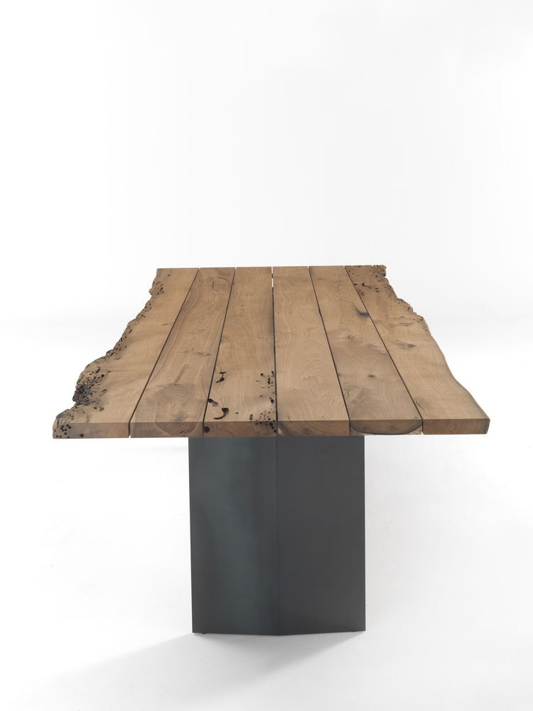 Table Sky-Natura Briccola from the Italian manufacturer Riva 1920. The model with rectangular top with legs in lacquered iron. The table top is made from oak wood of thickness 4 cm, with rough edges.