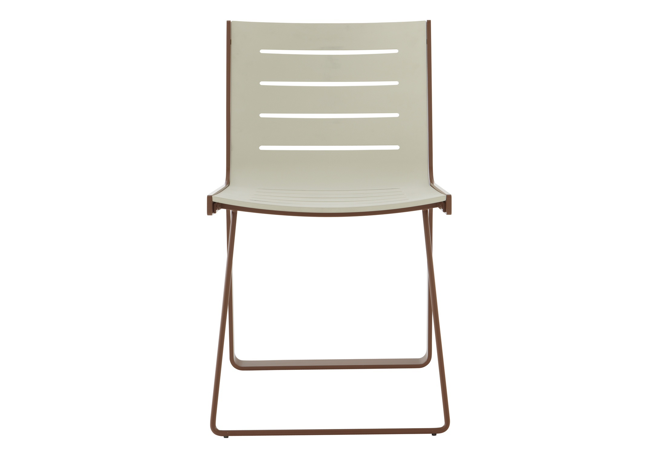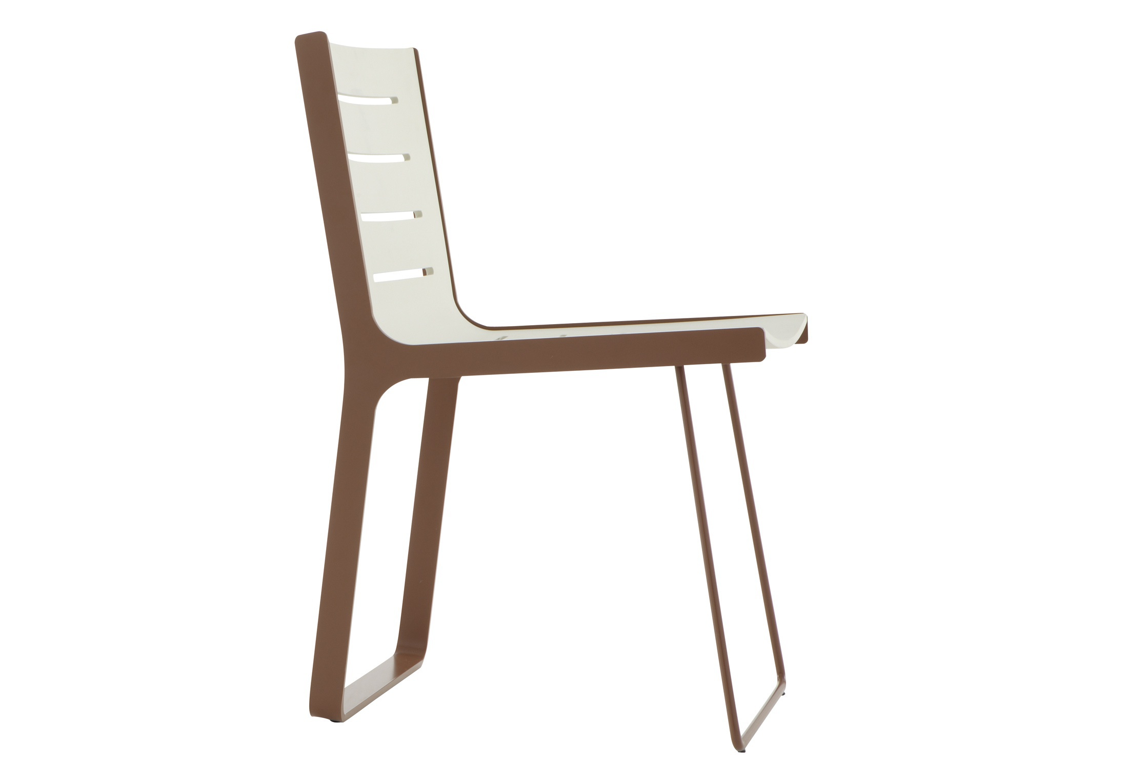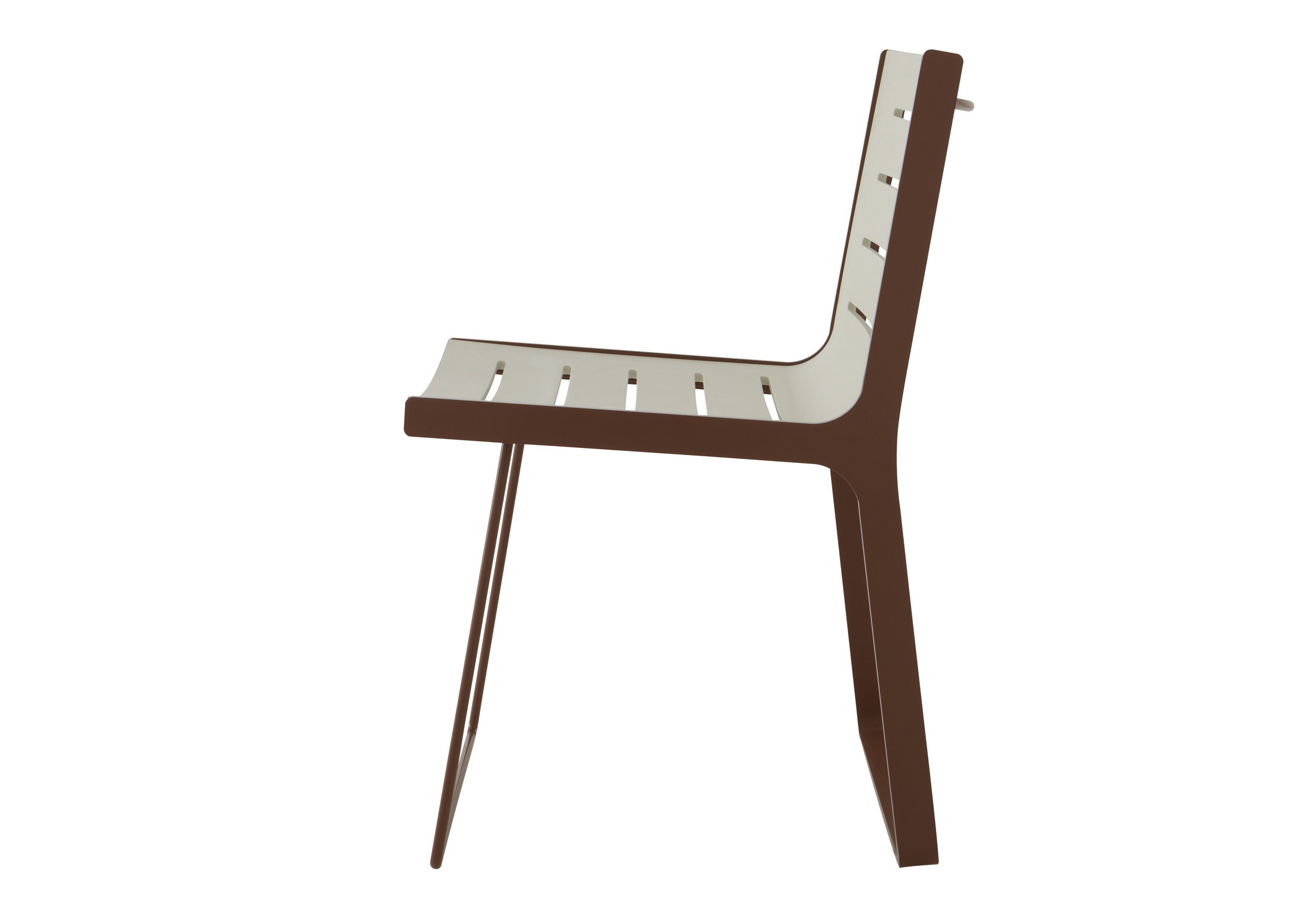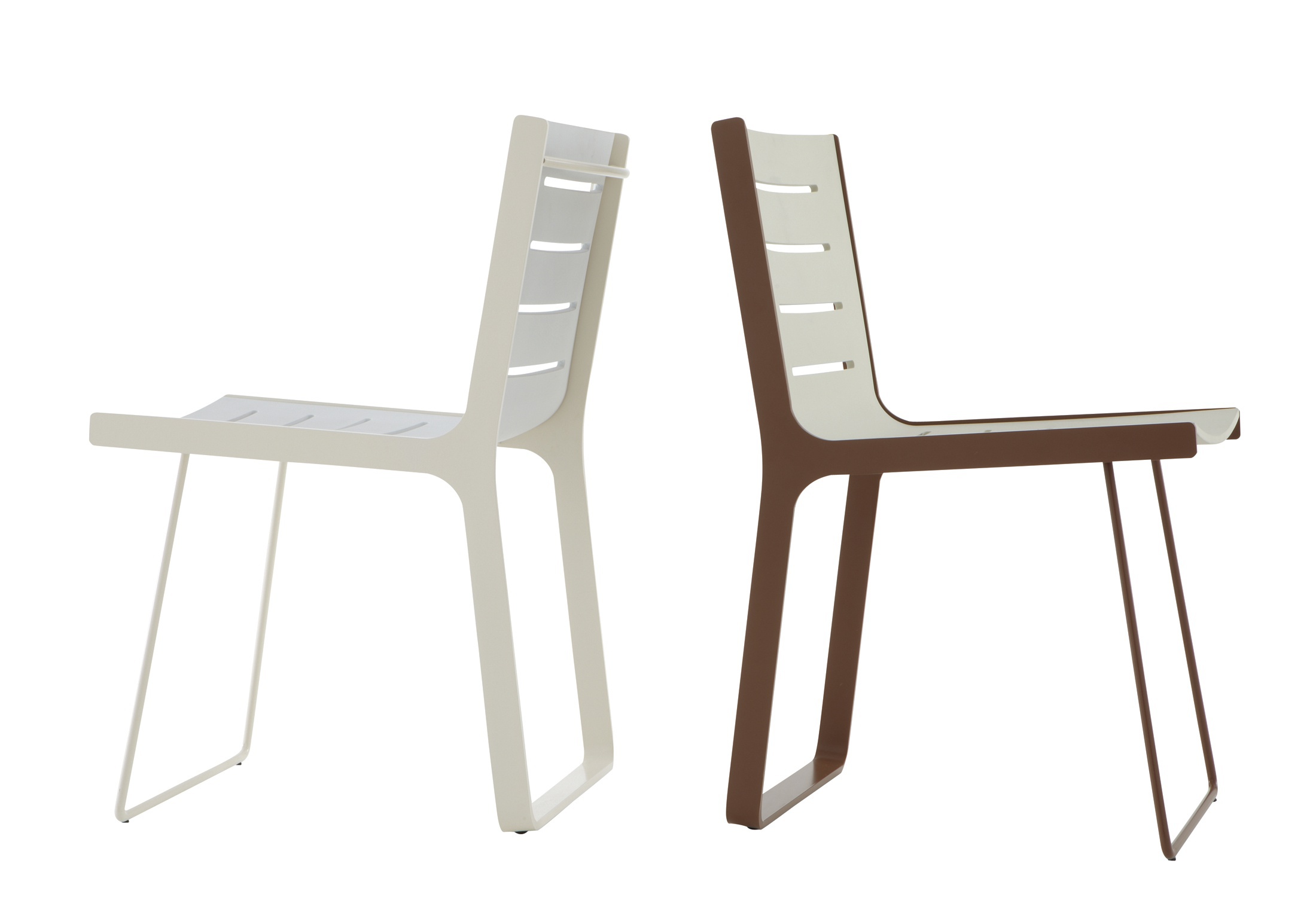 Chair ALUCHAIR from French manufacturer Ligne Roset. The chair is suitable for houses and streets, consists of wear-resistant elements, frame made of aluminum and steel, and corrugated bucket seats made of plastic. In addition to decorative effect, corrugated seat provides optimal comfort and runoff of rainwater in street use.