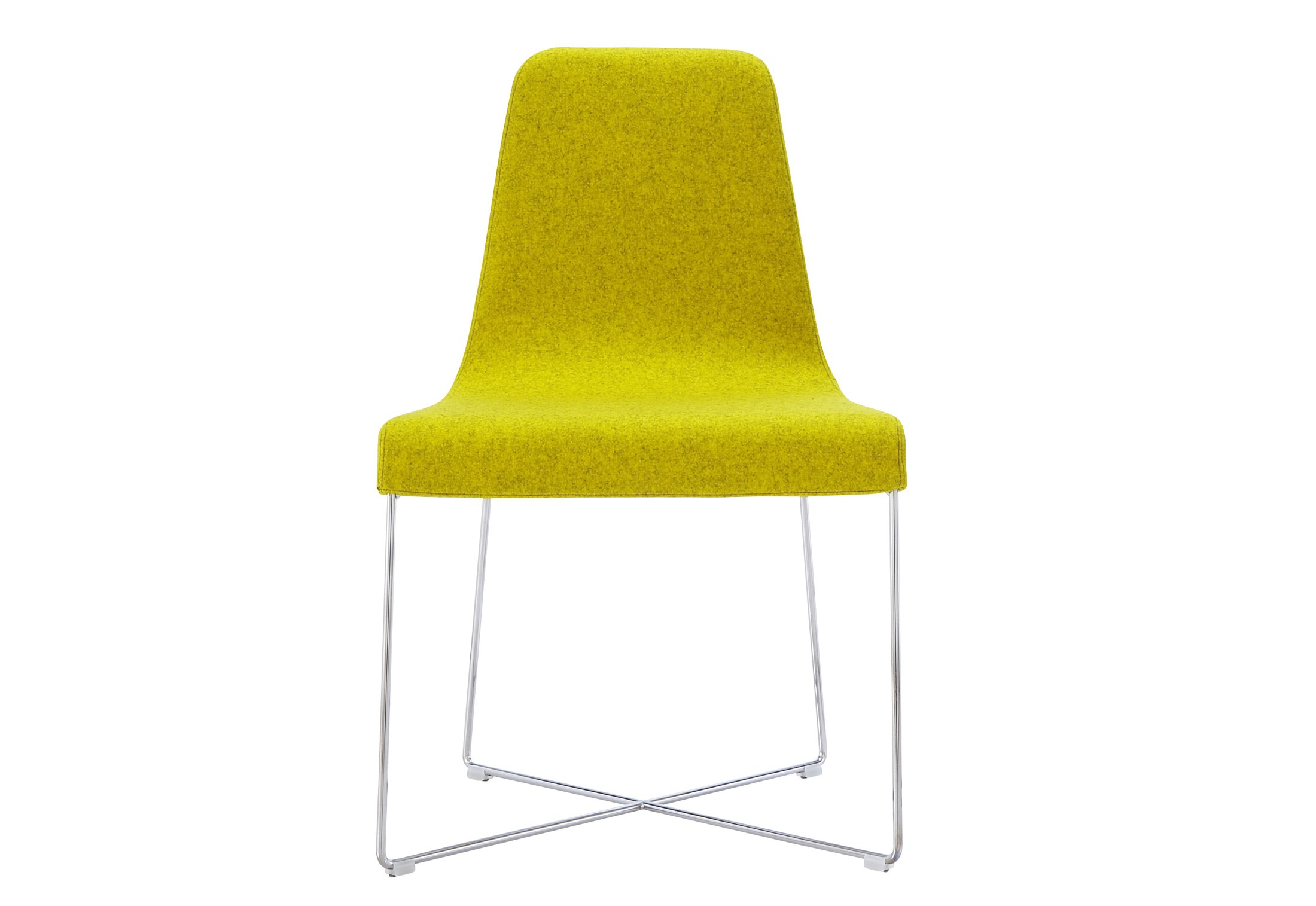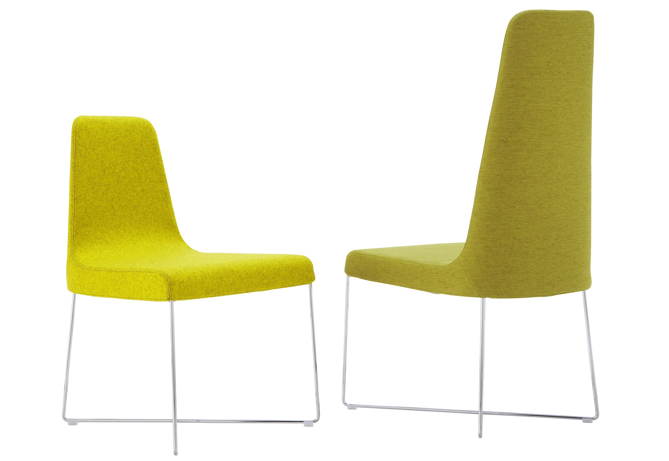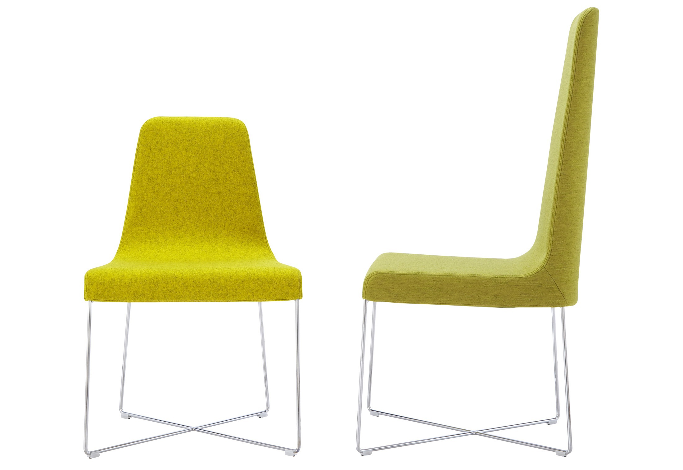SO the chair from the French manufacturer Ligne Roset. A good modern sketch, seemingly simple and clear, but actually very innovative, and very unusual kind: a solemn, due to the relatively thick seat, high back and unusual perekrestnoe basis, but at the same time soft, thanks to the rounded forms; and also graceful thanks to the base made of thin steel tubes and the backrest tapering upwards.