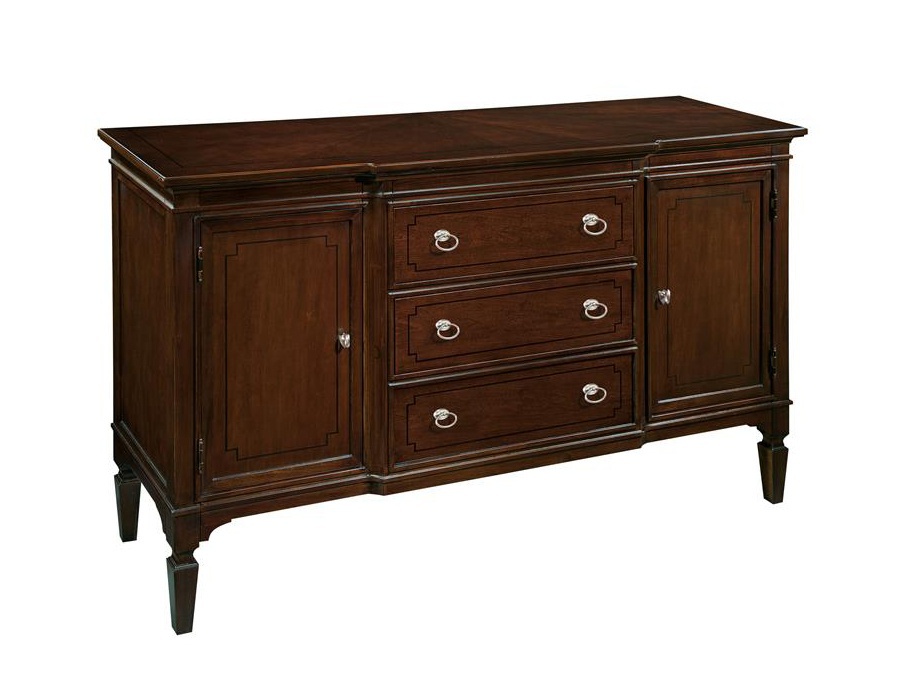 Sideboard New Traditions from the American manufacturer Hekman Furniture. A snack bar decorate the dining room, furnished in a traditional style. This low sideboard credenza the Italians call; it is convenient to put in the living room, which serves tea or coffee. Sideboard made of cherry wood and finished in cherry veneer. In the middle, slightly convex part are three drawers with silvery handles on the sides - two compartments with fixed shelves and hinged doors. The legs are tapered, chiseled; serving surface and decorated with figured veneer, in the form of diverging beams. The drawers inlaid with ebony. Careful selection of highly qualified professionals and follow the traditions of world cultures - that's the key to success and longevity of the company Hekman Furniture world market furniture manufacturers.