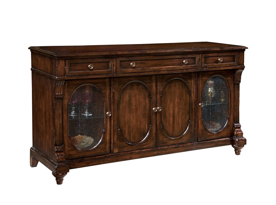 Designer sideboard, designed in the Victorian style, will decorate the dining room or kitchen. This low sideboard credenza the Italians call; it is convenient to put in the living room, which serves tea or coffee. This stylish buffet is made of wood and decorated with carvings. At the top, hanging in the form of a frieze, there are three drawers - two small on the sides and wide, with felt insert in the middle. Two side swing doors decorated with oval crackle glass, each covering a compartment with a glass shelf. The middle two doors are decorated with panels in the form of ovals, each has wooden shelf. Legs and protruding side pillars are carved, fittings - antique brass. Careful selection of highly qualified professionals and follow the traditions of world cultures - that's the key to success and longevity of the company Hekman Furniture world market furniture manufacturers.