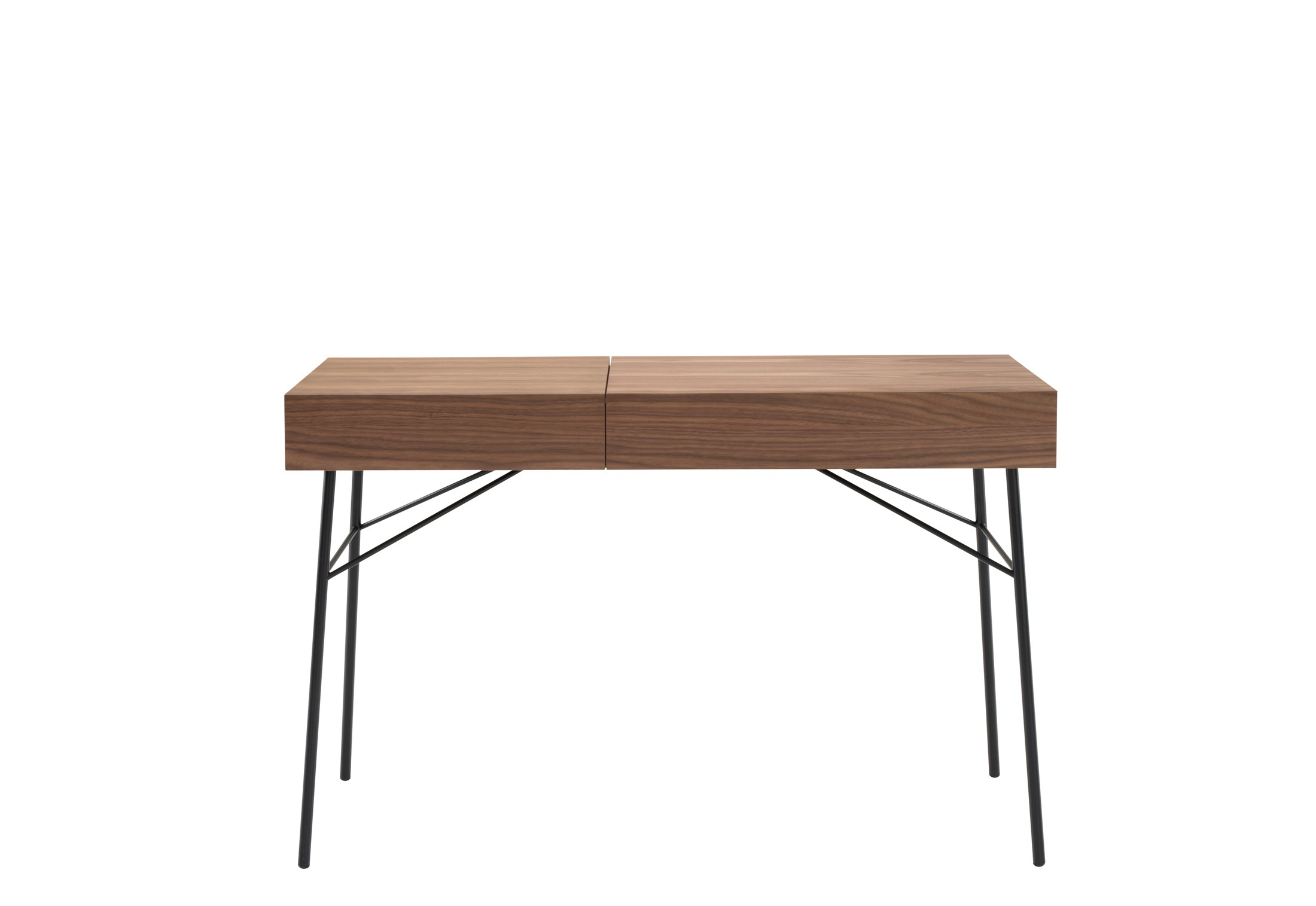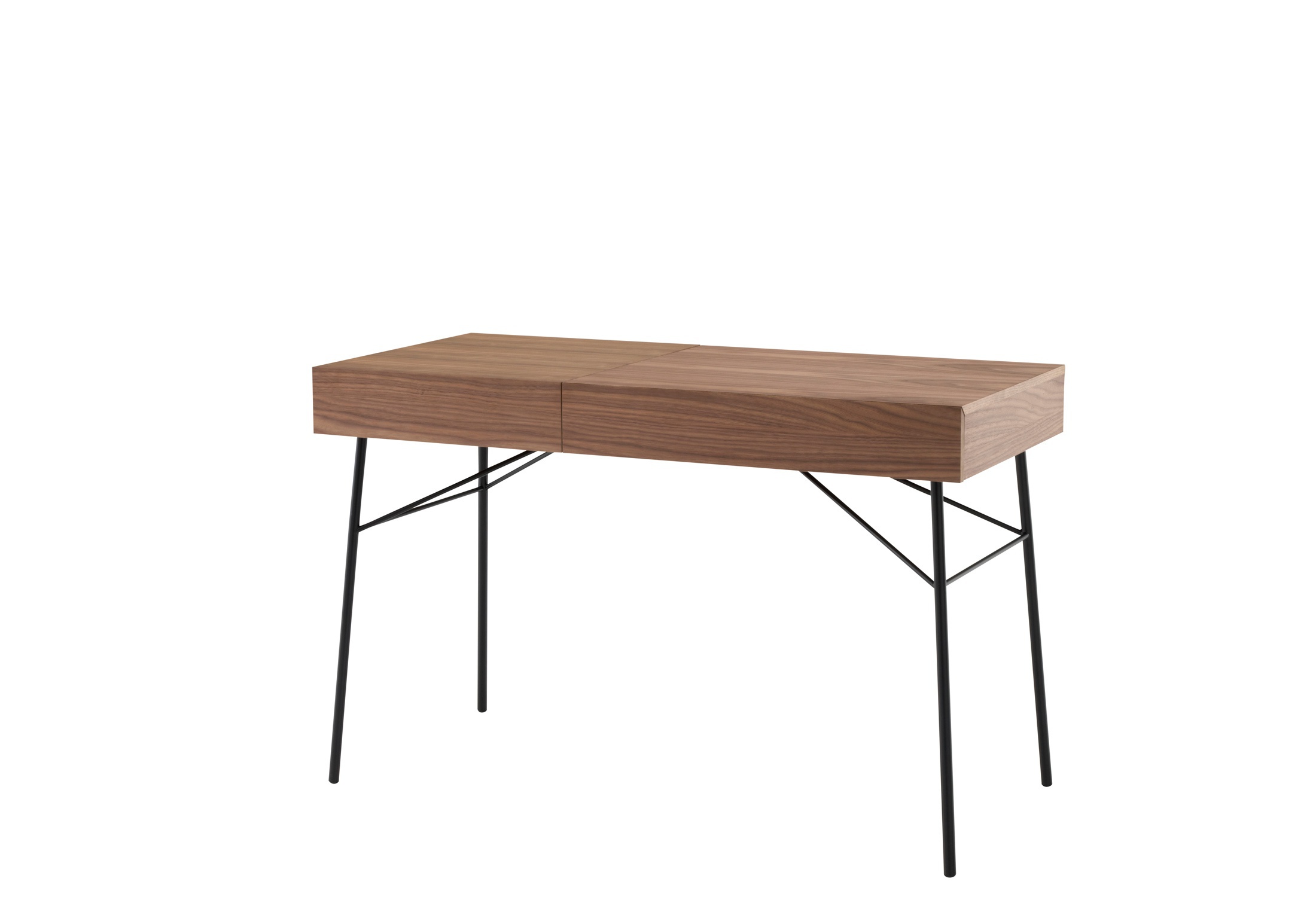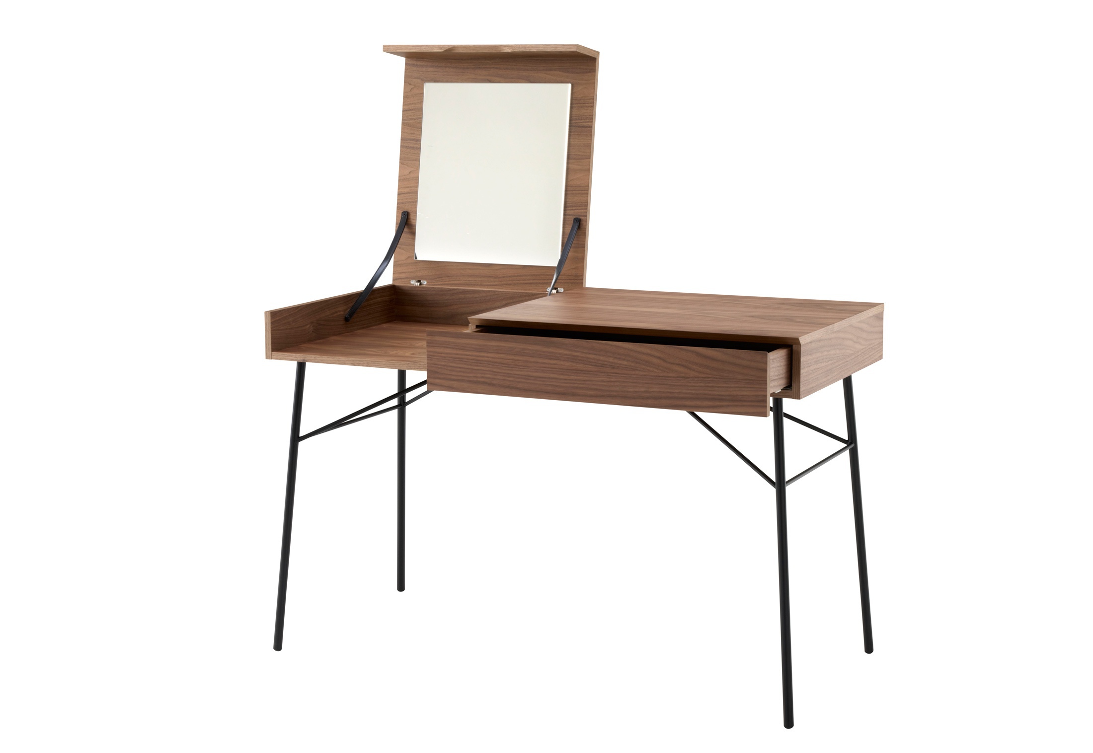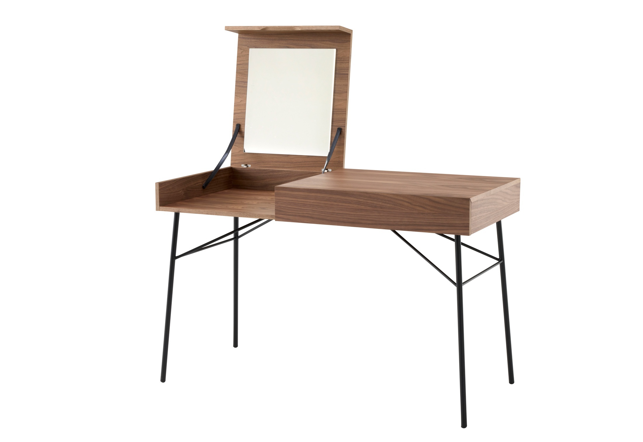 JULIETTE dressing table from French manufacturer Ligne Roset. Case dressing table rests on four graceful legs, covered with black varnish. The countertop has a large surface for storage, also has a drawer and a niche with opening lid with large mirror. Table a veneered American walnut, which gives it elegance and warmth. The model is made in modern style.