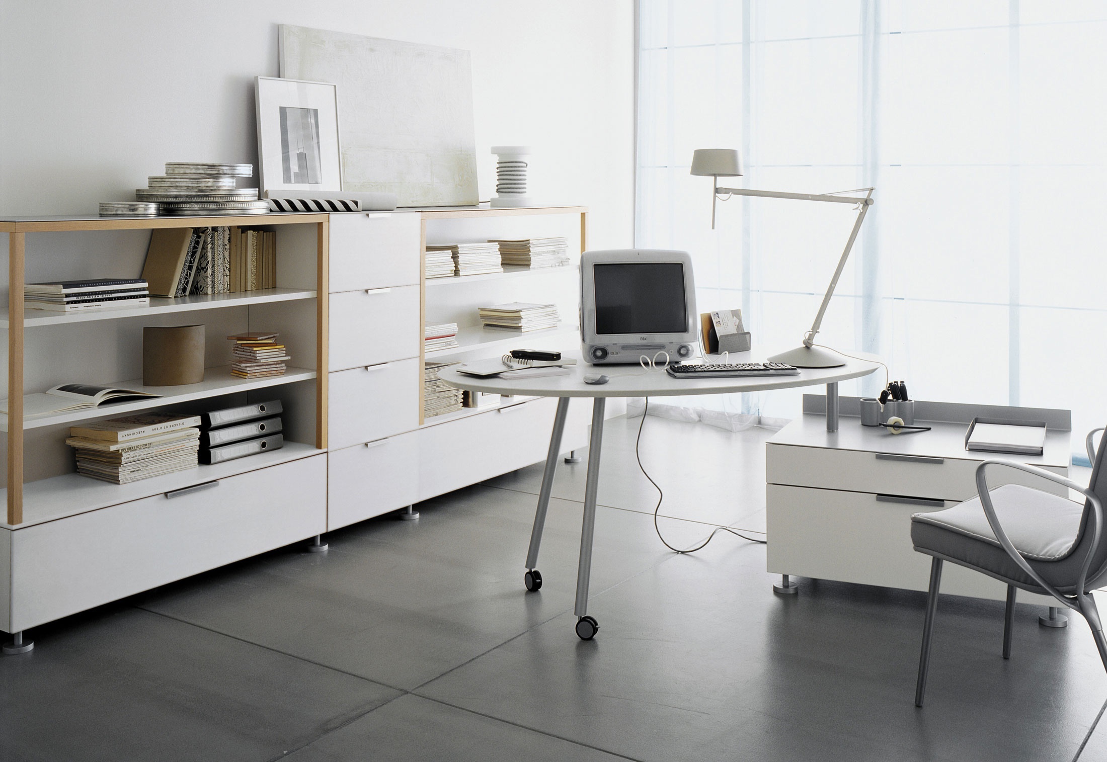 Desktop EVERYWHERE from French manufacturer Ligne Roset. Oval desktop from practical easy-care laminate with a bedside table with one drawer. The table may include a rack for folders or rack for CD/DVD. Table top in white lacquer, the bedside table: white lacquer or oak. The model is made in modern style.