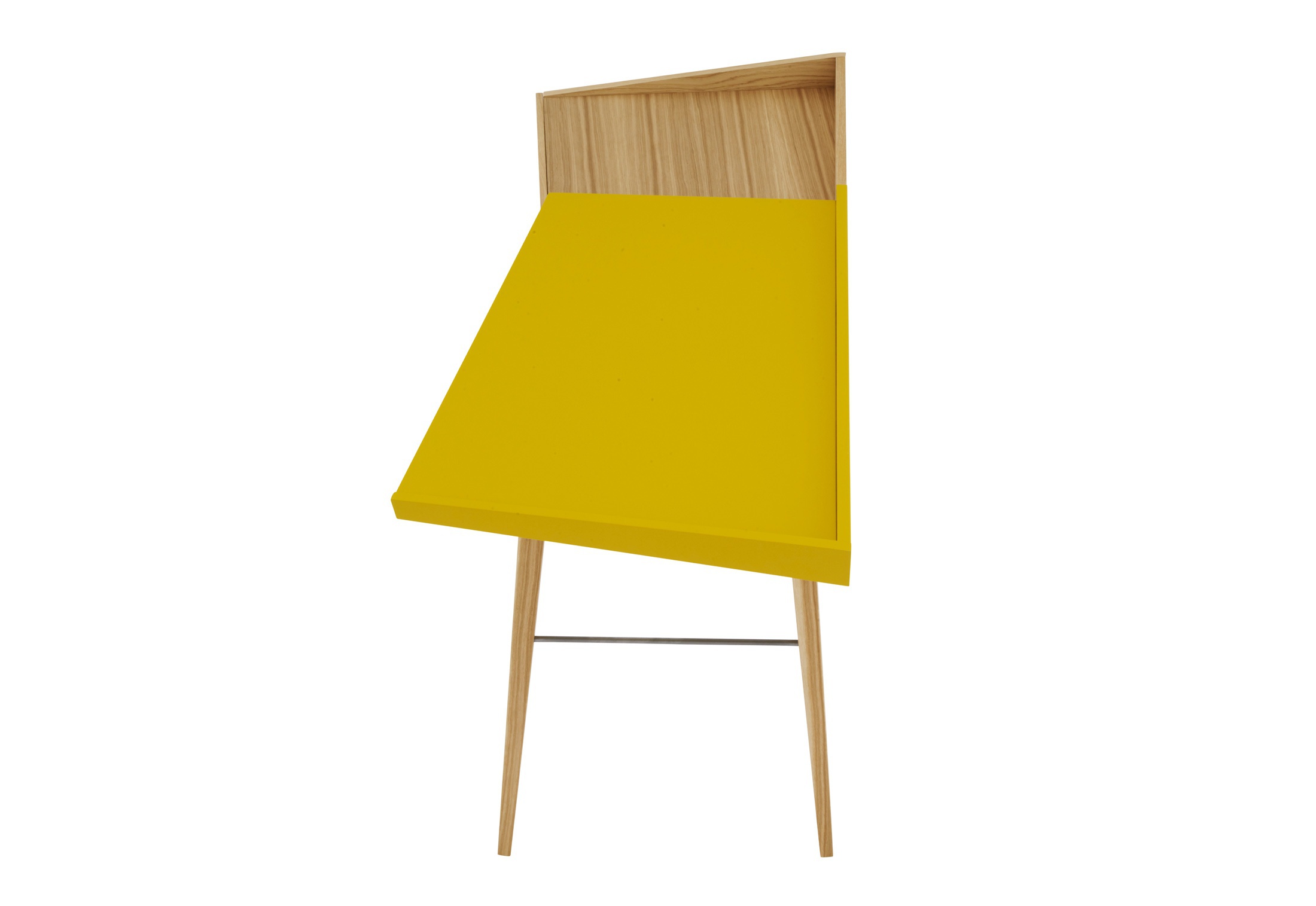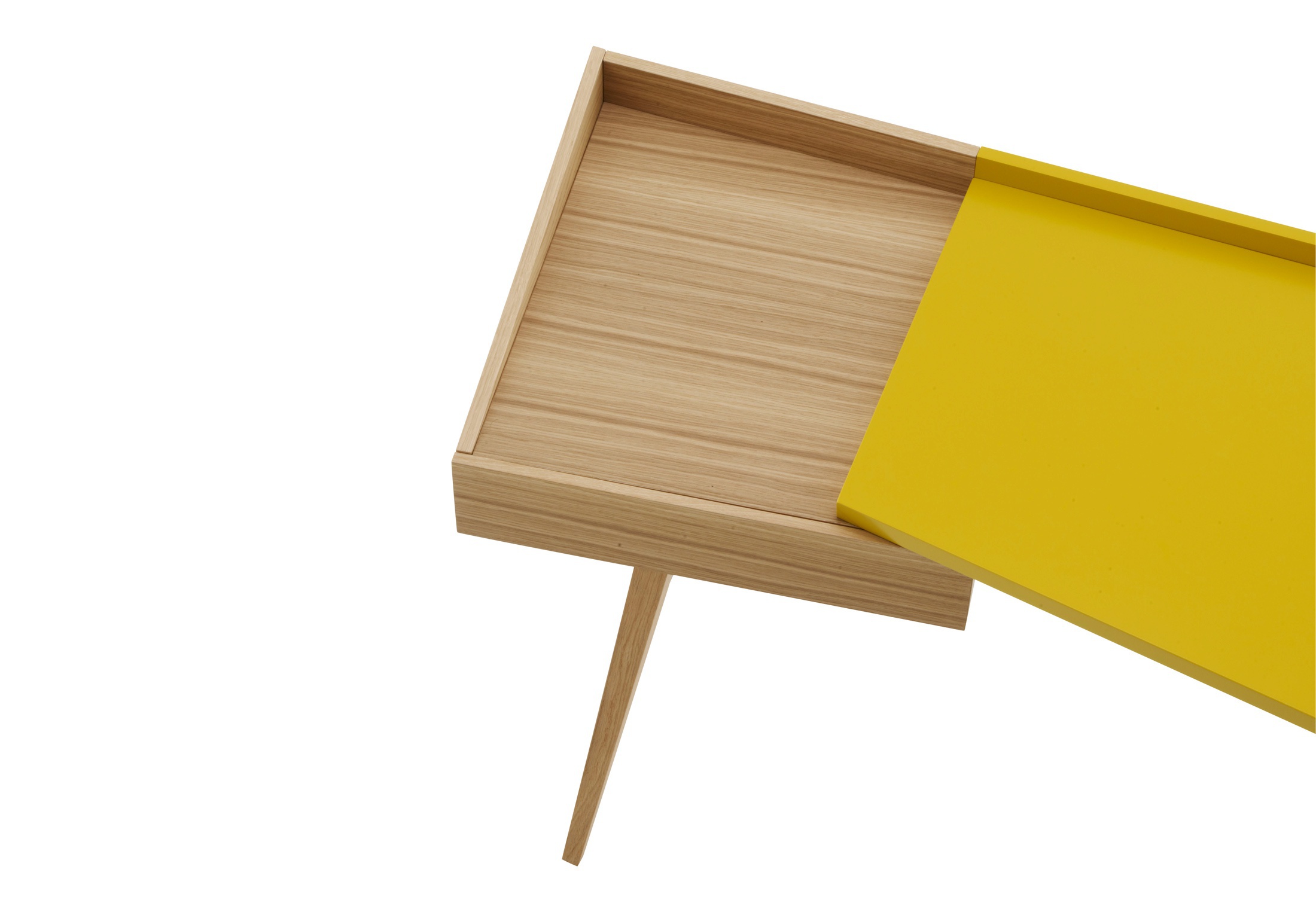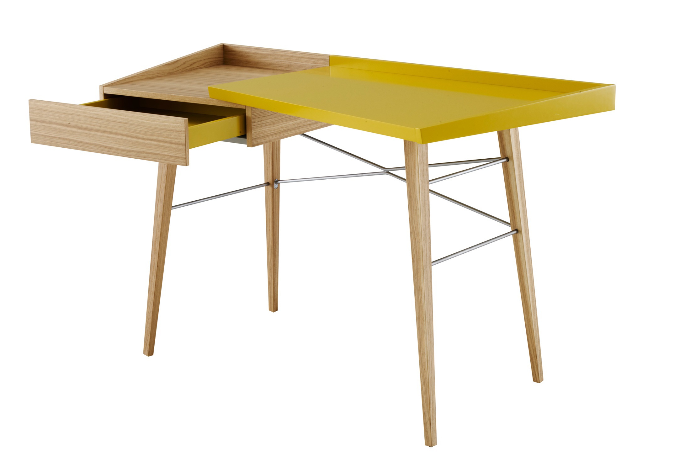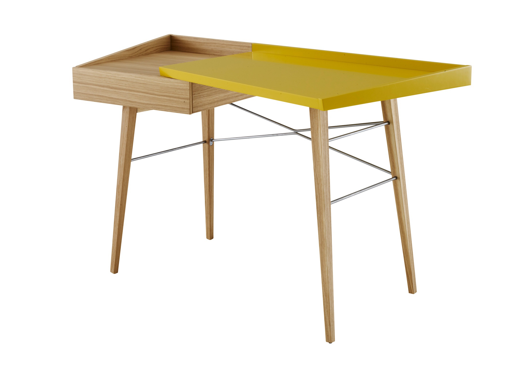 LITHO Desk from French manufacturer Ligne Roset. The table embodies a poetic approach to the creation of the working area. Desk with the slim oak legs. Left side of the table fitted with a drawer, covered with oak veneer, stained black, or has a natural oak color. To create contrast right side varnished. The model is made in modern style.