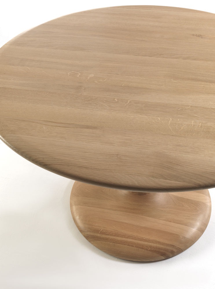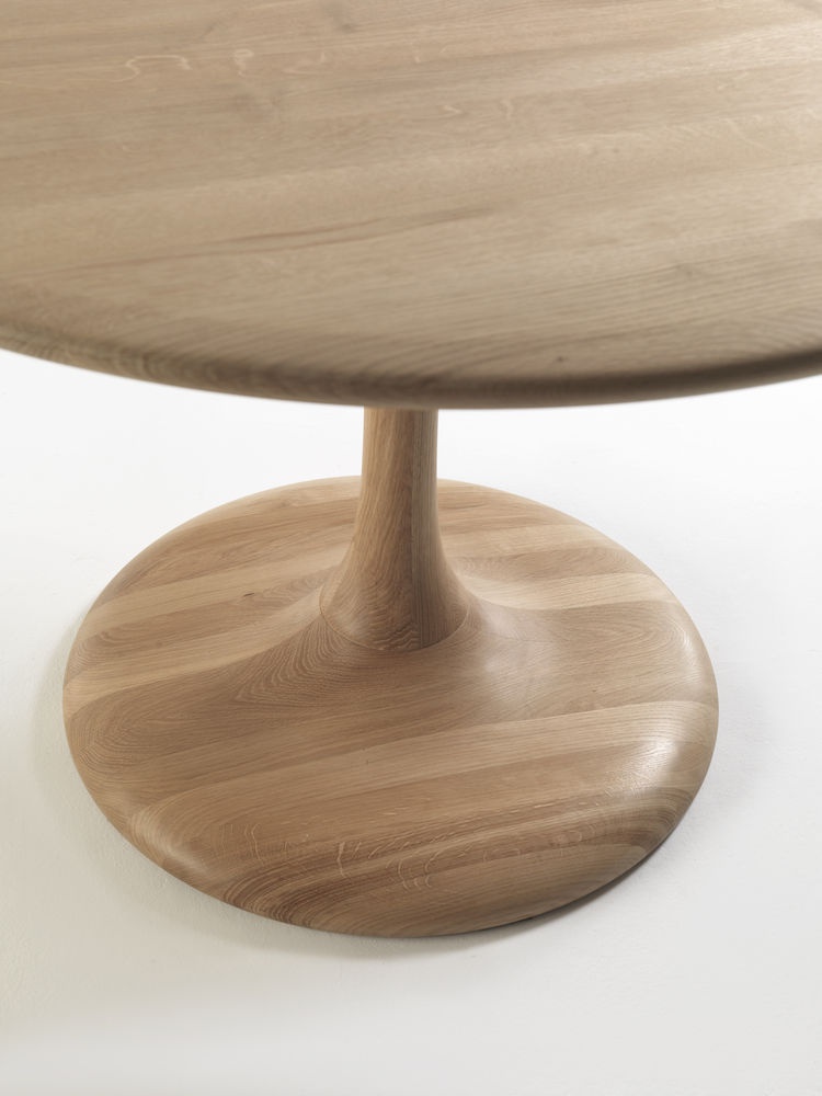 The Peo table from the Italian manufacturer Riva 1920. Model with a round top. The table is completely made of solid wood of various species in the catalog of the company.