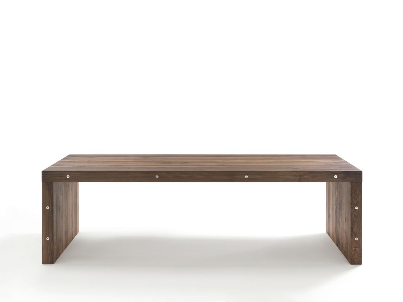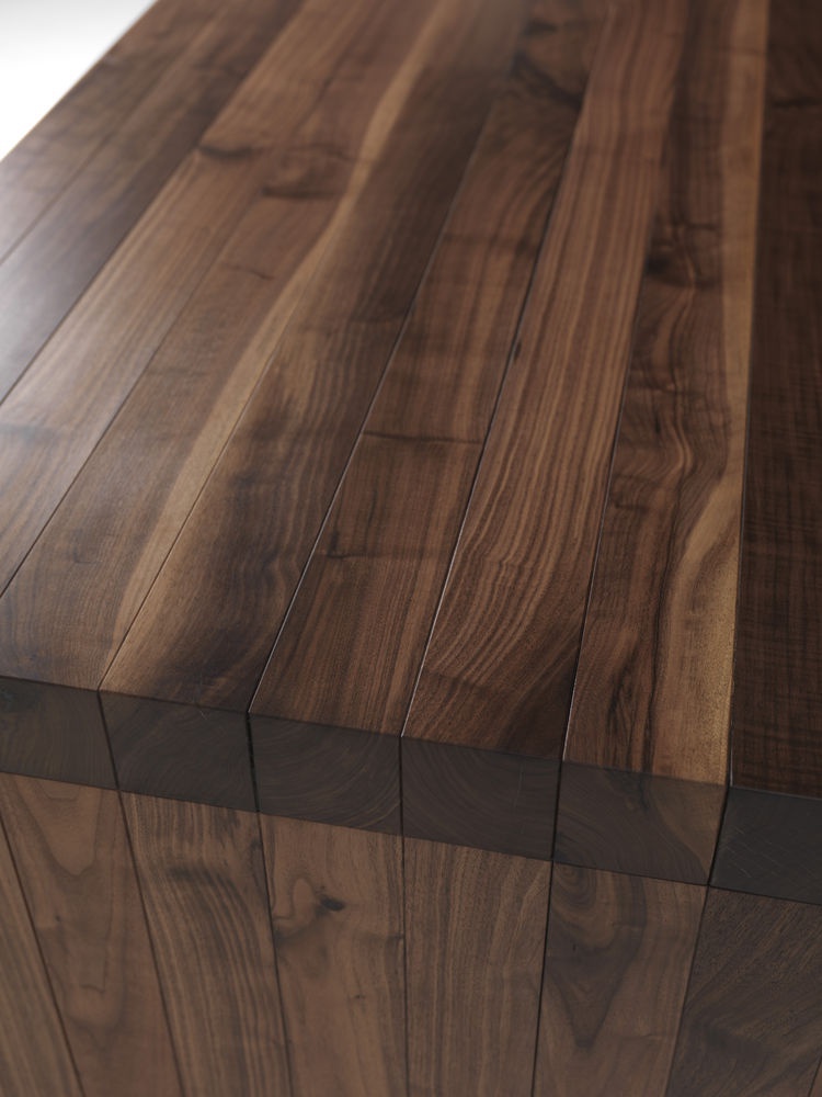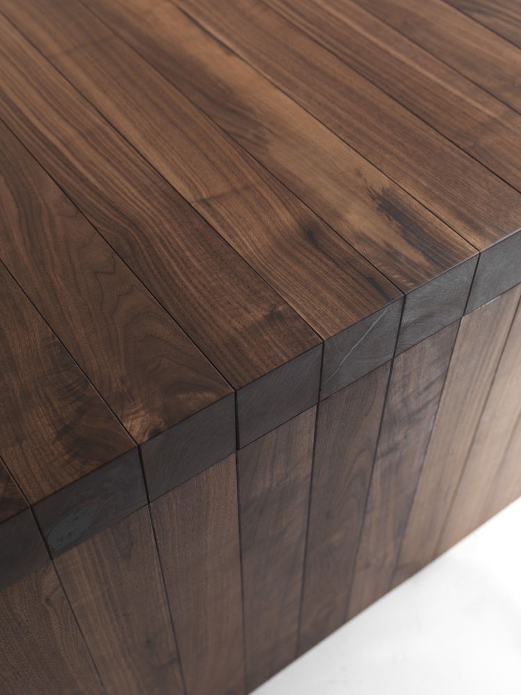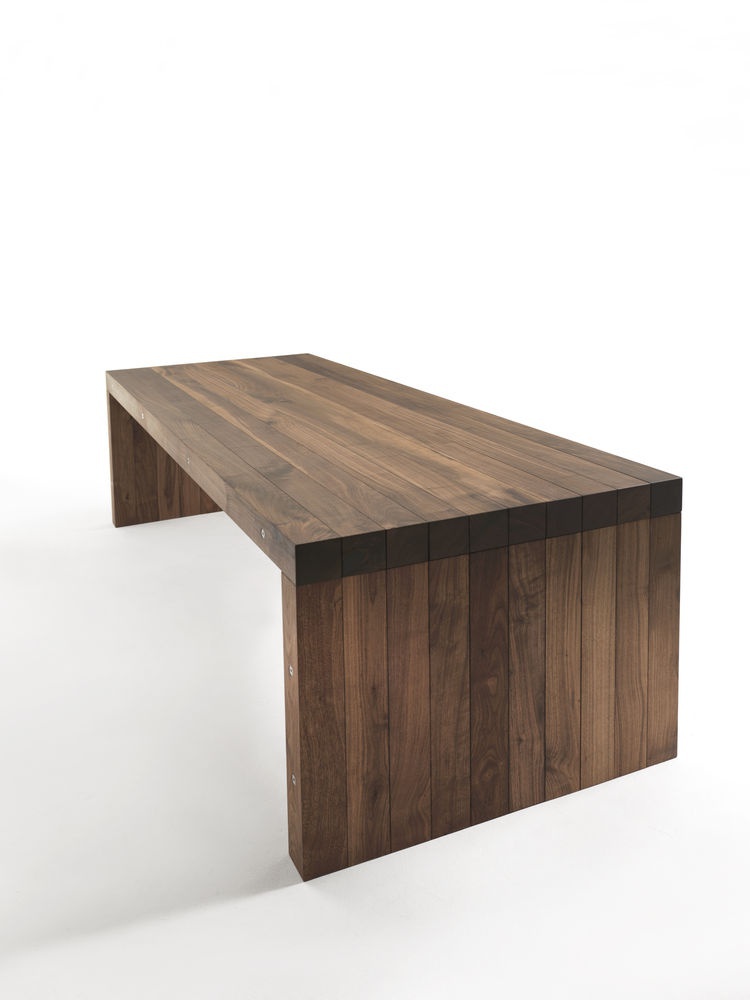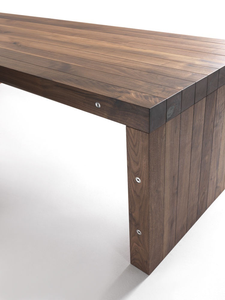Nerio table from the Italian manufacturer Riva 1920. Model dining with rectangular table top. The table is fully made of solid American walnut timber, thickness 9 cm. Legs and top are assembled using a system of long connecting bolts.