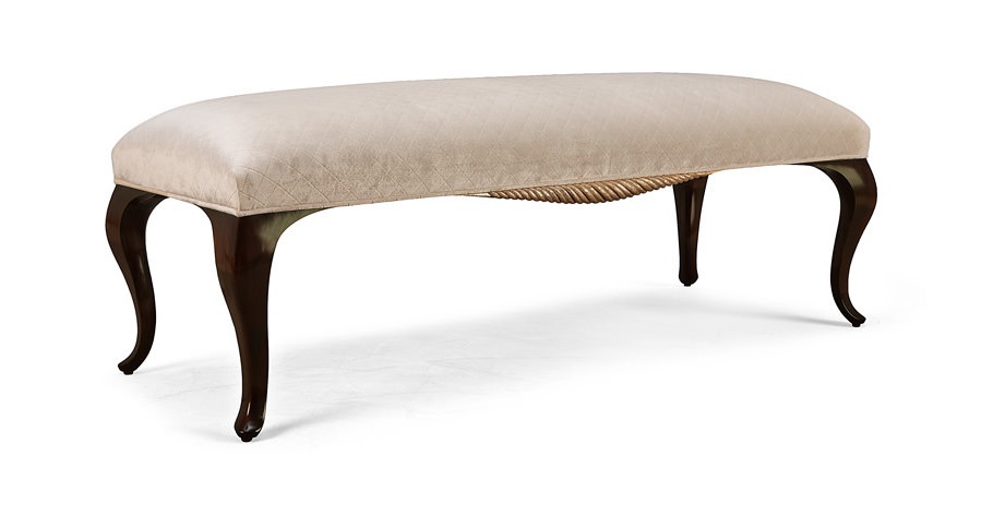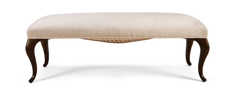 Harriet bench from American producer Christopher Guy (Harrison & Gil). The frame is natural wood, hand carved. The surface is covered with varnish. The seat is upholstered with fabric. Filler foam. The model is made in art Deco style. Colours in stock.