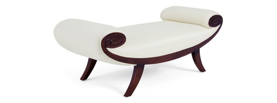 Bench Medea from the American producer Christopher Guy (Harrison & Gil). The frame is natural wood, hand carved. The surface is varnished dark colour. Upholstery - textiles. Filler foam. The model is made in art Deco style. Colours in stock.