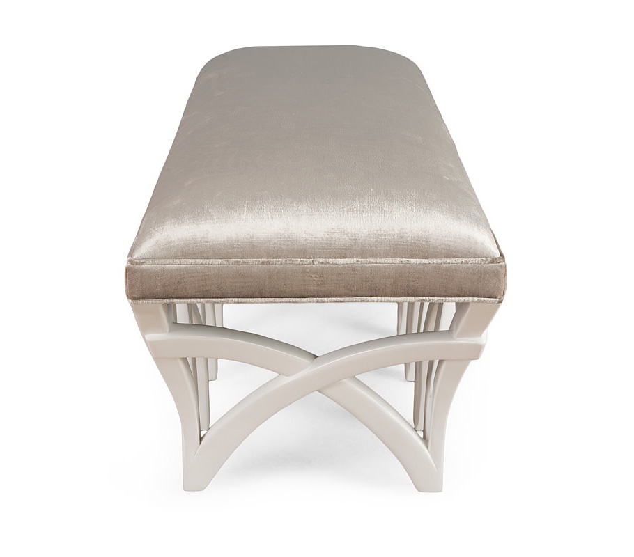 Bench Helena from the American producer Christopher Guy (Harrison & Gil). The frame is natural wood. The surface is varnished in white. The seat is upholstered with fabric. The model is made with an art Deco style, combines tradition and design. Colours in stock.
